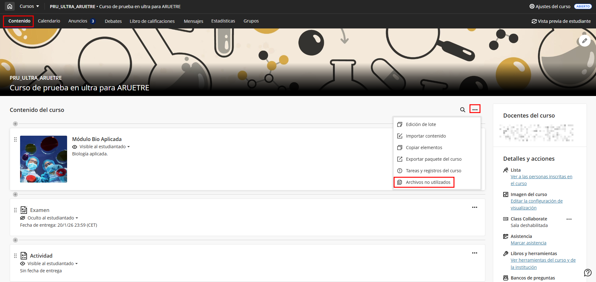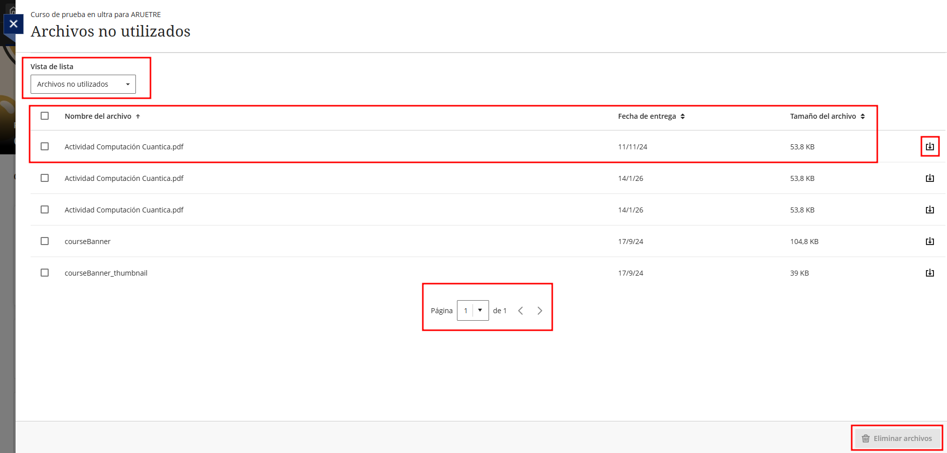 La herramienta Archivos no utilizados del Aula Virtual permite al profesorado identificar archivos almacenados en el curso que actualmente no están siendo utilizados en ningún contenido o actividad. Estos archivos suelen permanecer en el repositorio del curso después de modificaciones, actualizaciones de materiales o eliminación de recursos.