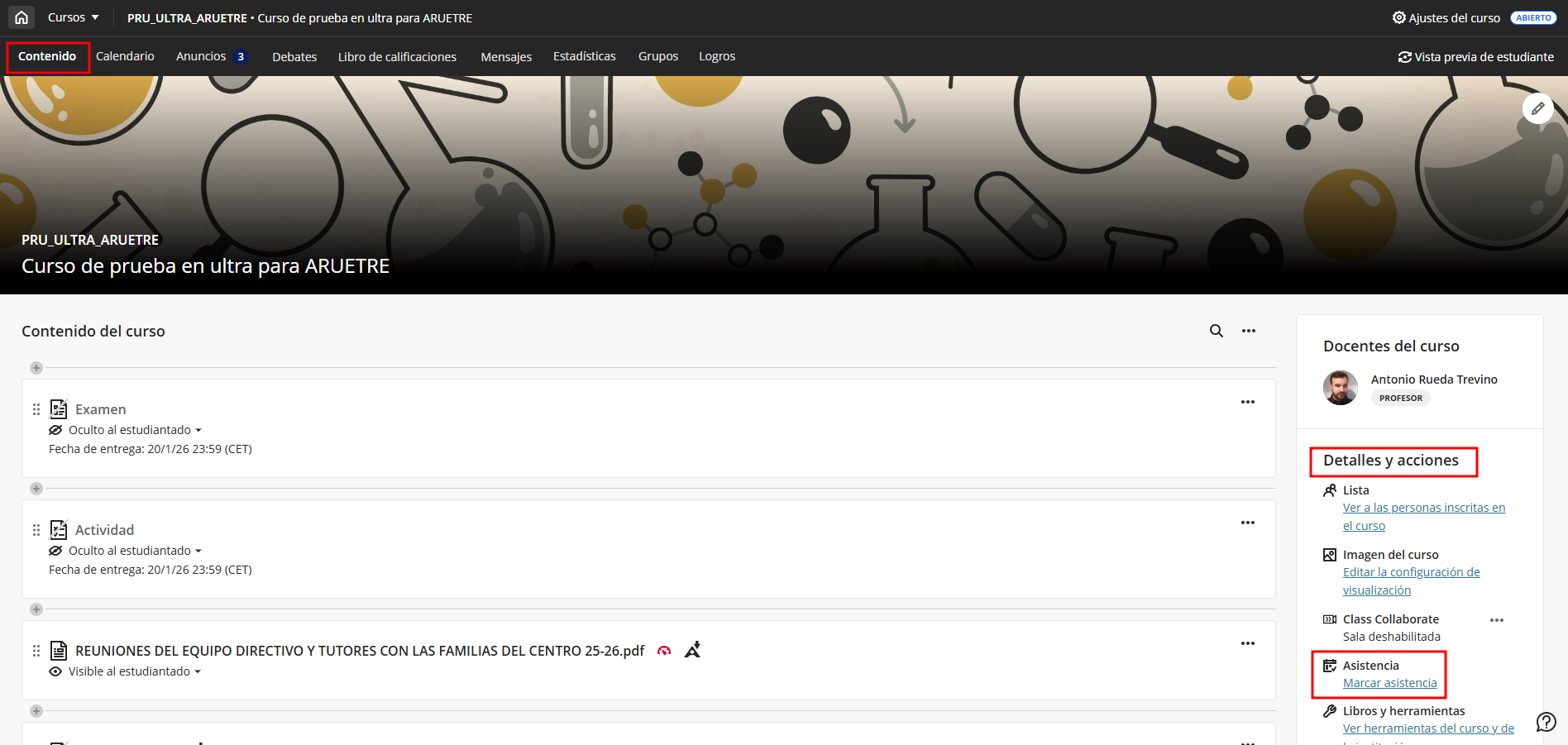 La asistencia puede marcarse manualmente o apoyarse en la actividad del alumnado dentro del curso, según la configuración establecida. Toda la información queda integrada en el entorno de la asignatura, facilitando el seguimiento continuo y una visión clara del grado de participación a lo largo del curso.