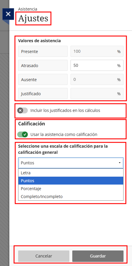 Mediante esta opción se puede usar la asistencia como calificación. Al activarla, Aula Virtual convierte los registros de asistencia en una nota que puede integrarse en el libro de calificaciones del curso.