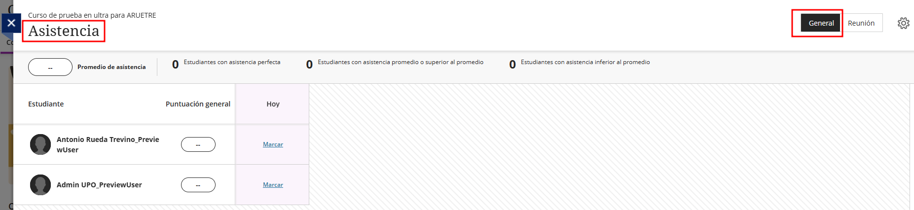En la parte superior se muestra el nombre Asistencia, que identifica la herramienta activa. A la derecha aparecen las pestañas General y Reunión, que permiten alternar entre: