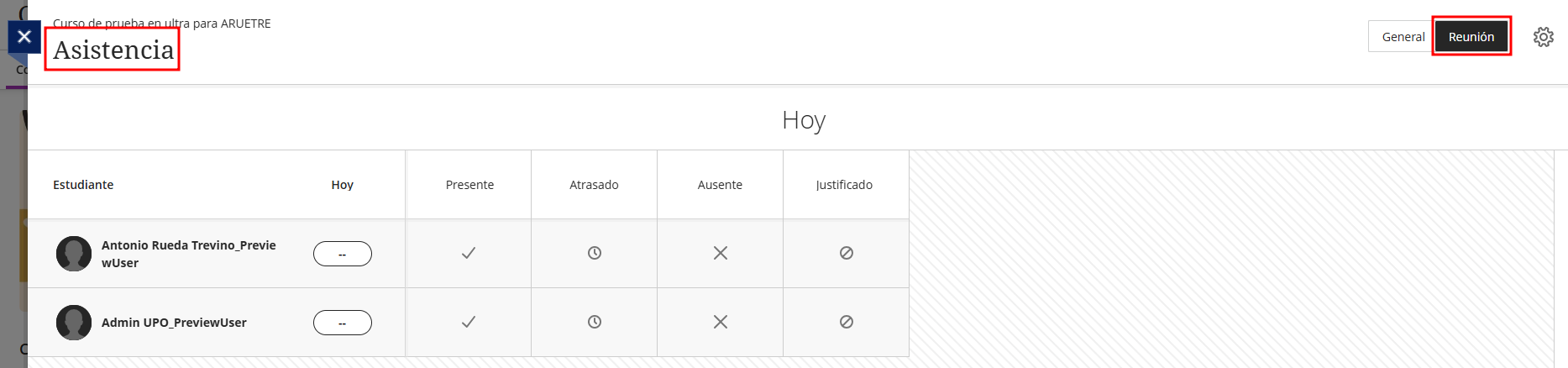 - Reunión: asistencia asociada a sesiones de clase virtual, si están configuradas.