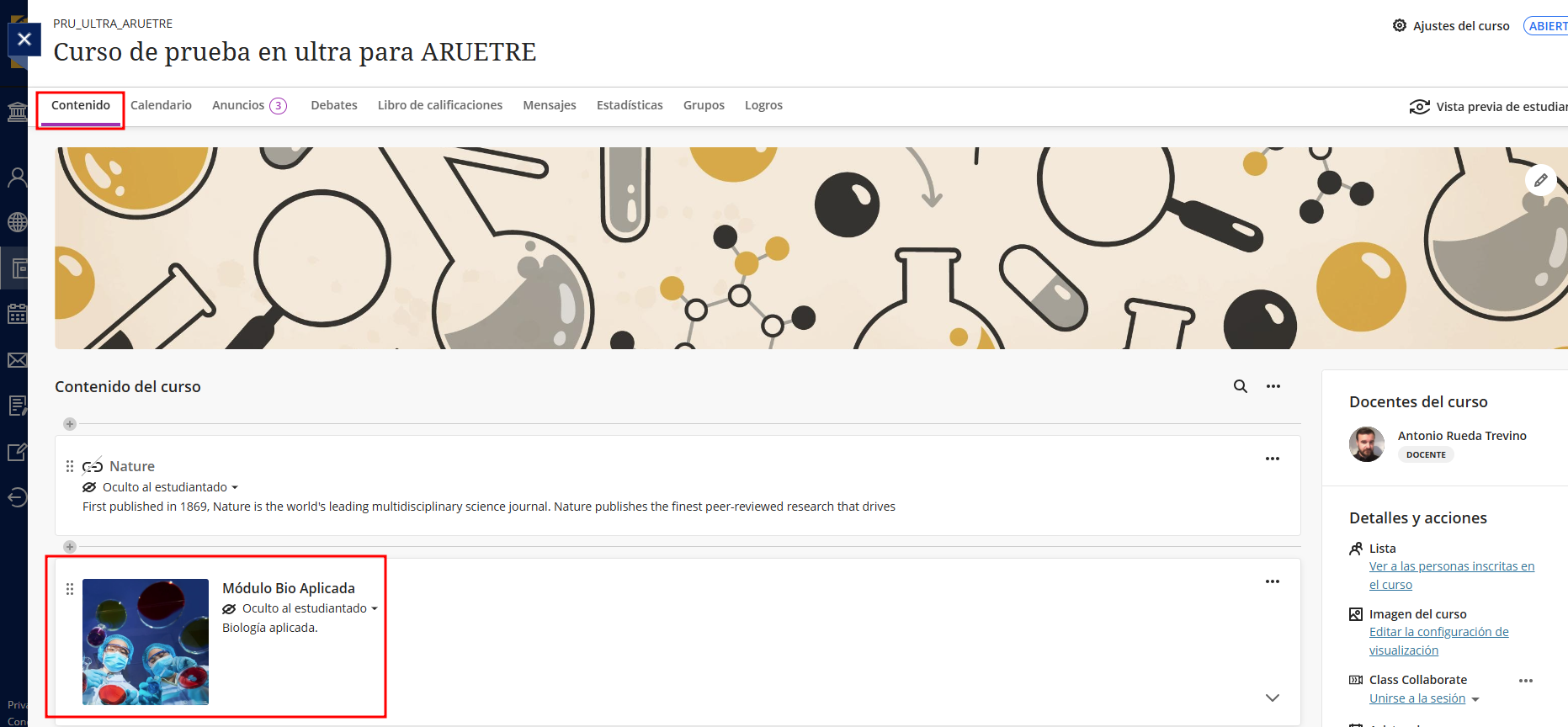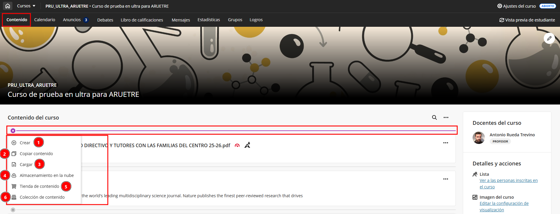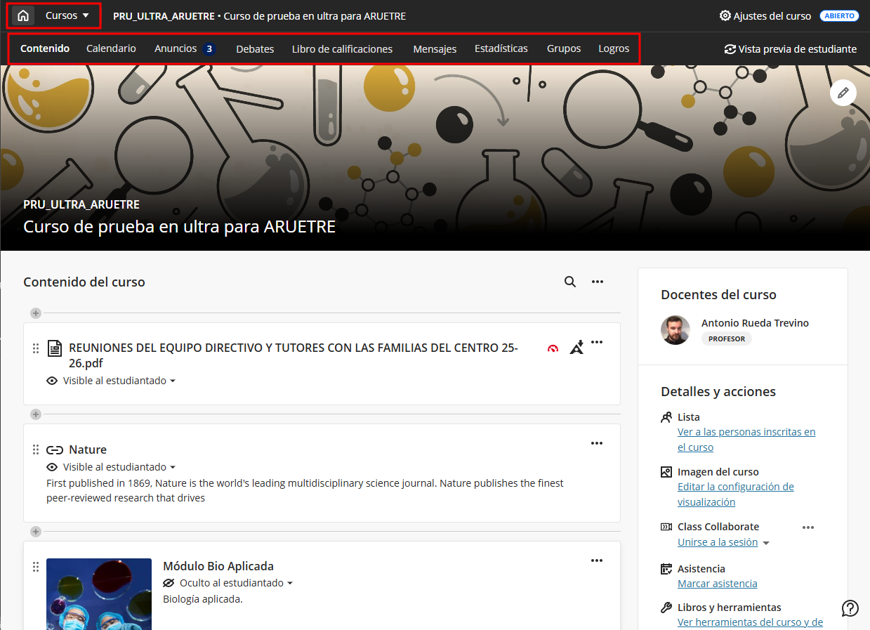La pestaña Contenido es el núcleo de cada curso en Blackboard. Desde aquí se organiza y gestiona toda la información que se compartirá con el alumnado: documentos, enlaces, actividades, evaluaciones, foros y más.