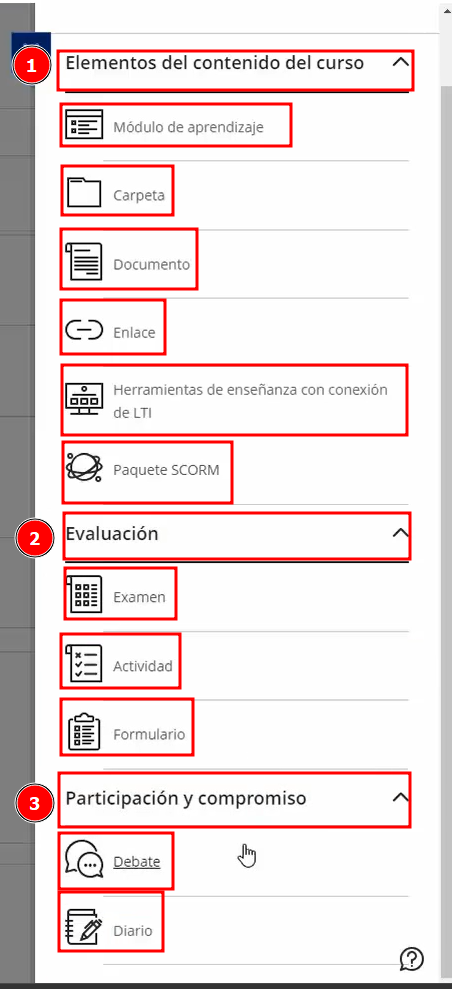 Al seleccionar la opción Crear (+) dentro de la sección de contenido, se abre un panel lateral con todas las herramientas disponibles para añadir recursos al curso. Estas opciones se agrupan en tres grandes categorías: