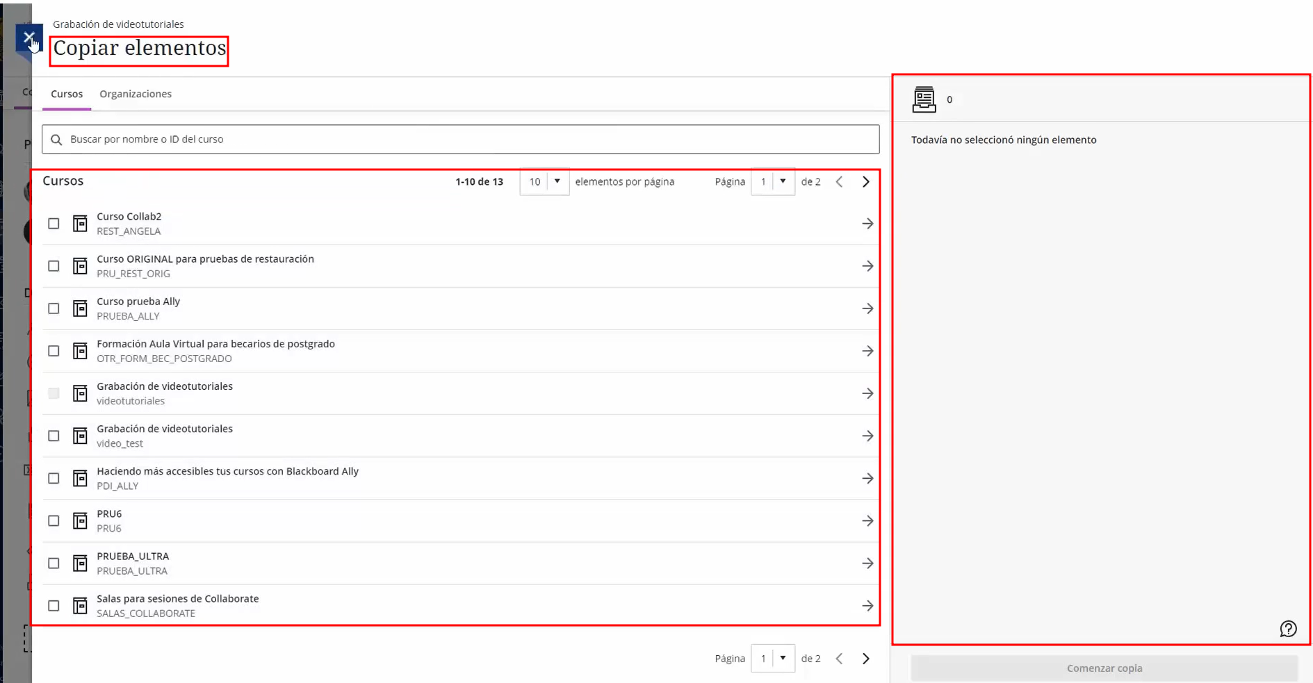Al acceder a copiar contenido, nos aparece una ventana con nuestros cursos disponibles desde donde podremos copiar de uno o varios cursos de forma simultanea.