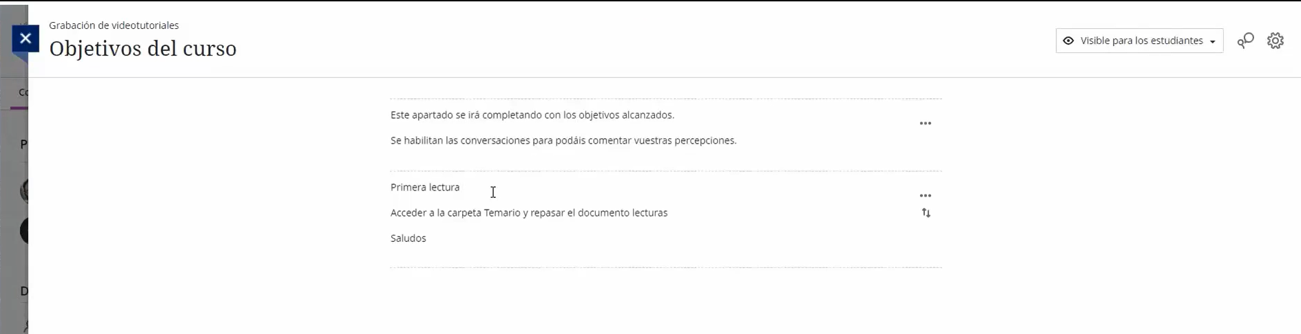 - Título visible para estudiantes y docentes. Puede incluir el nombre oficial de la asignatura y el curso académico.