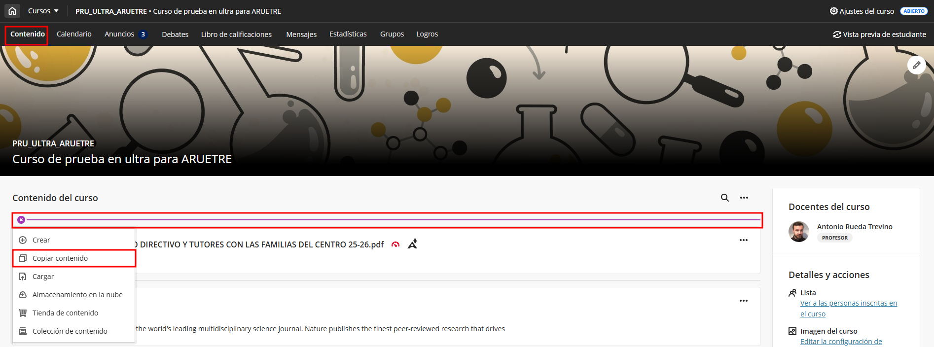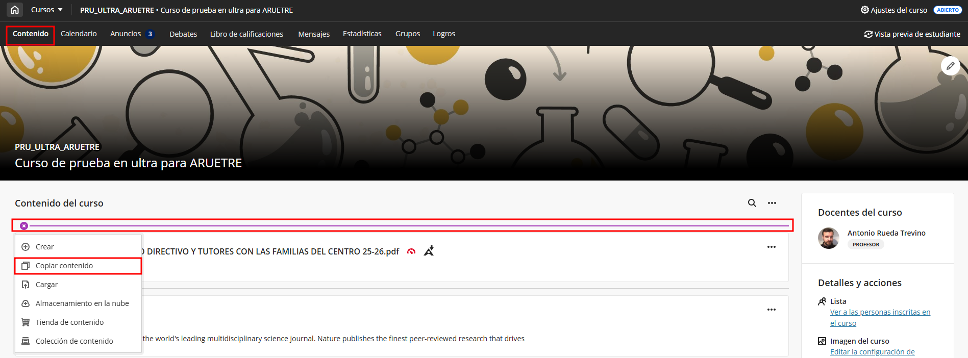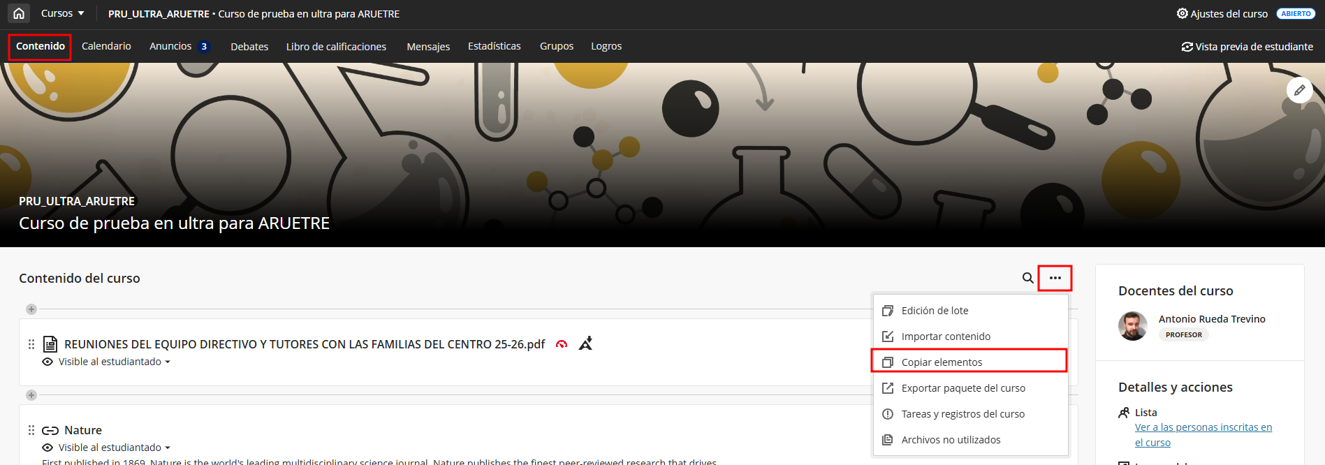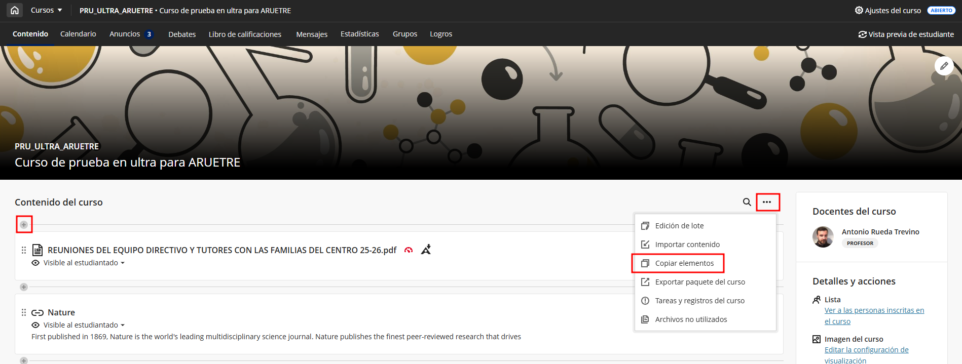 Nos dirigimos al menú general en la parte superior derecha y hacemos clic sobre Copiar elementos. El contenido se copiará en la carpeta principal del curso.