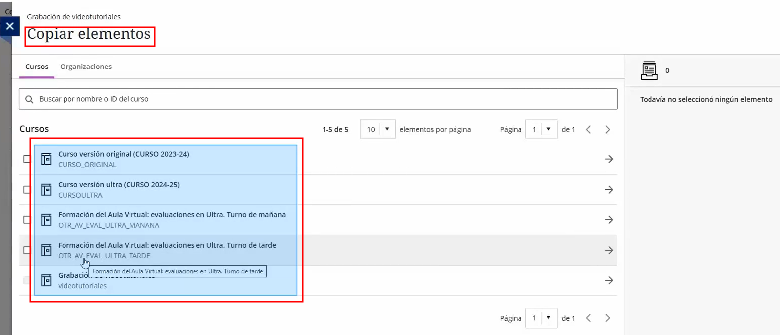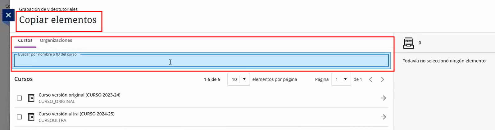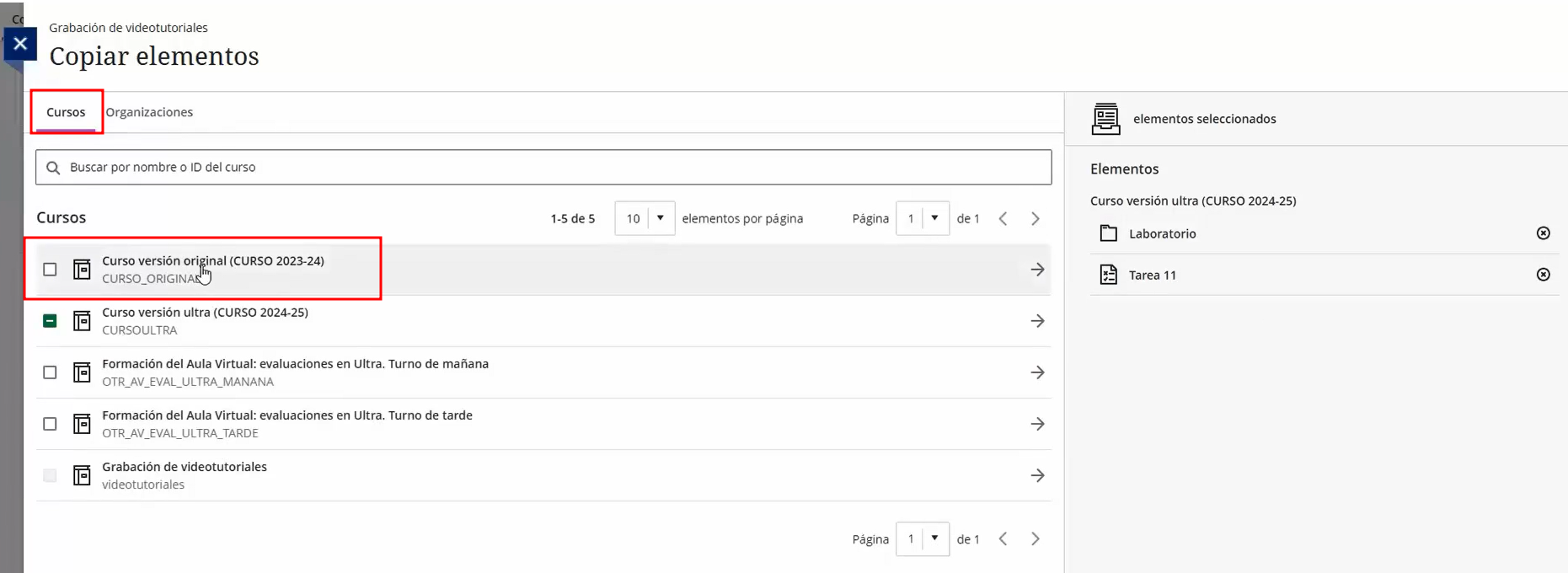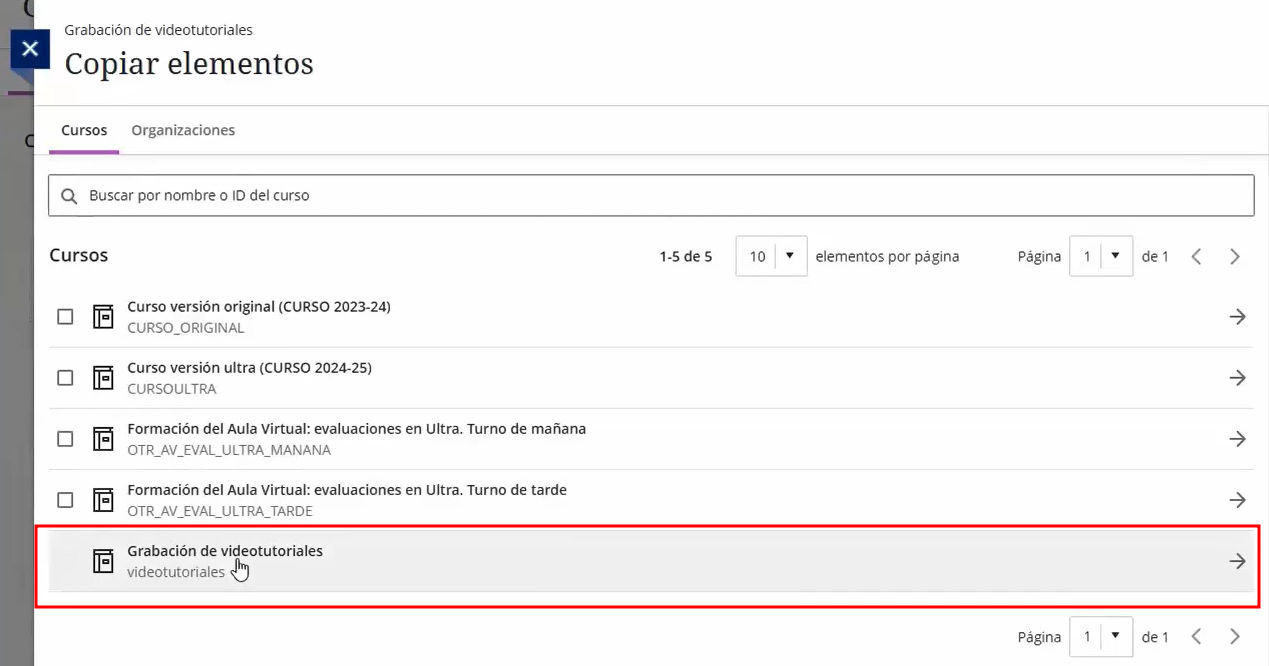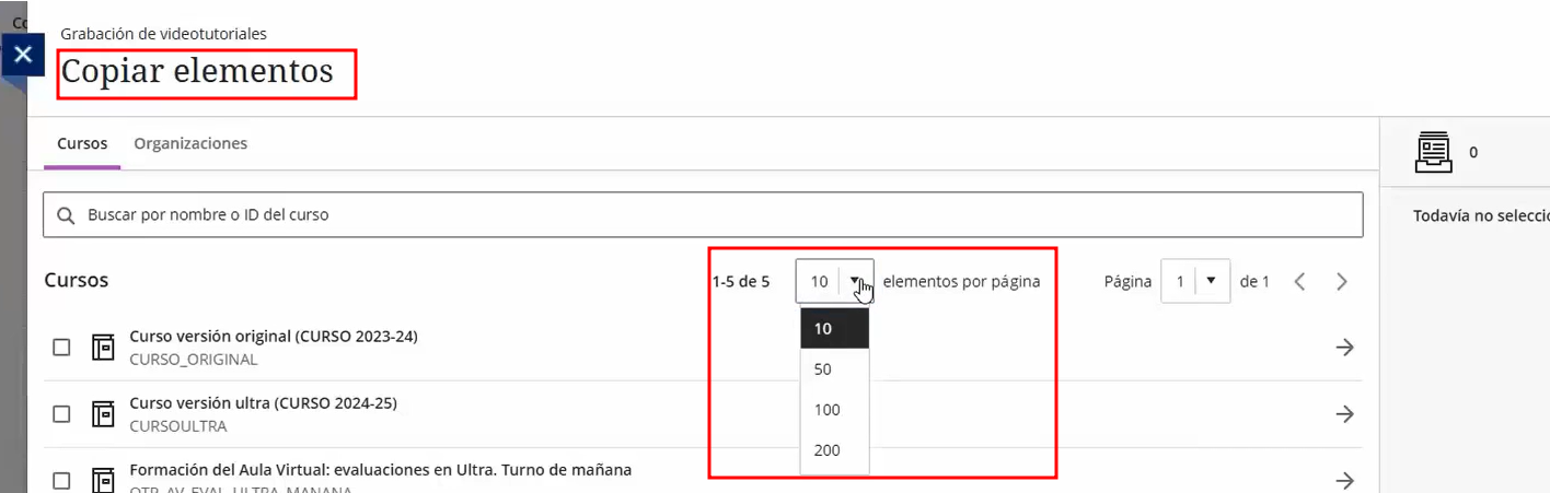 Podemos mostrár más o menos cursos por páginas con el menú elementos por página.