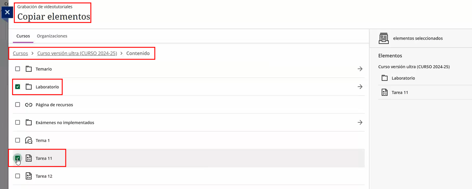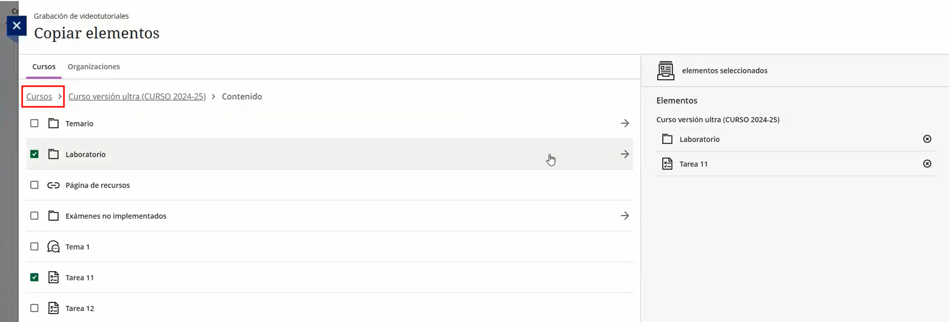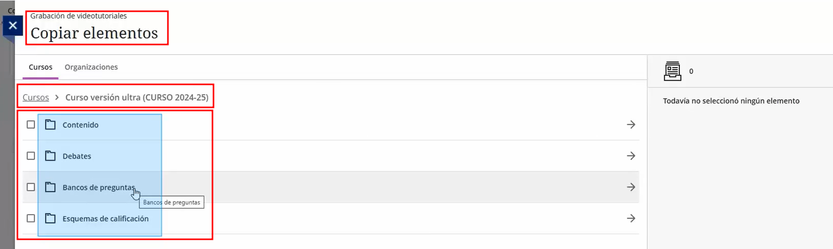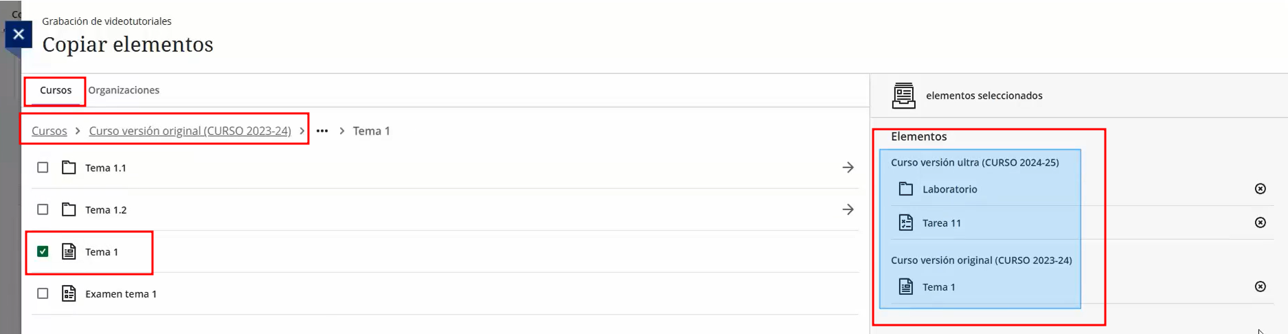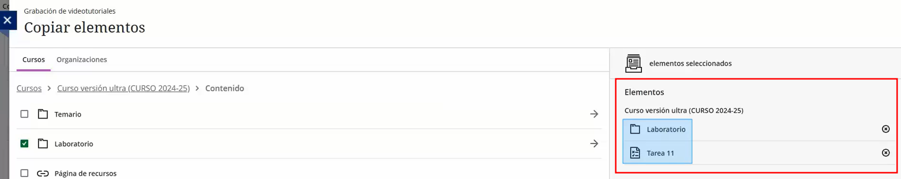 - Seleccionar únicamente elementos concretos (temas, actividades, recursos, evaluaciones, etc.).