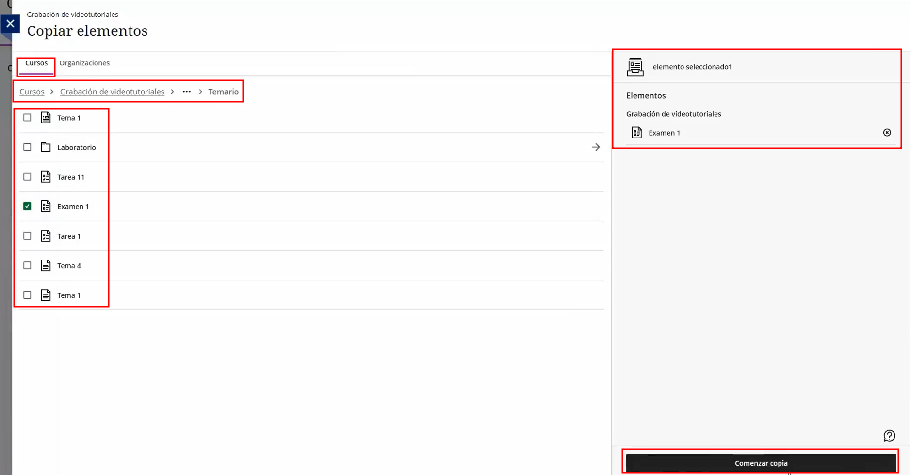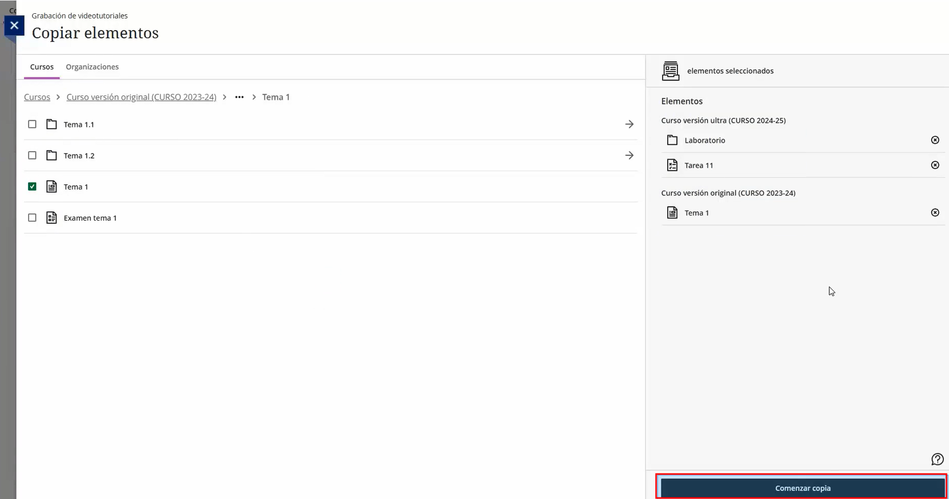 Ya dentro localizamos el contenido a copiar/duplicar, lo marcamos y pulsamos sobre Comenzar copia.