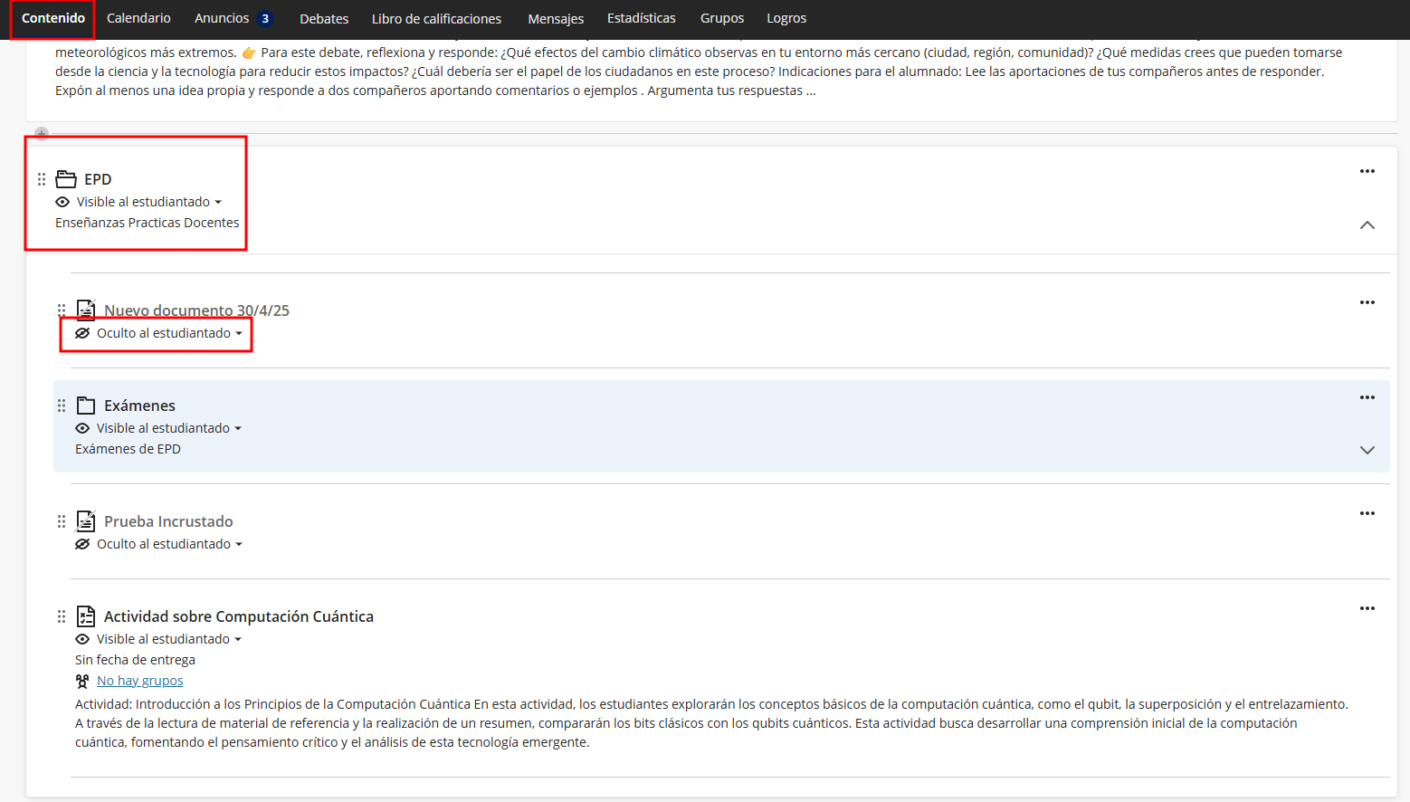 Por defecto, todo el contenido copiado aparece oculto al estudiantado. Siendo el profesorado el que controla cuando puede ser visible.
