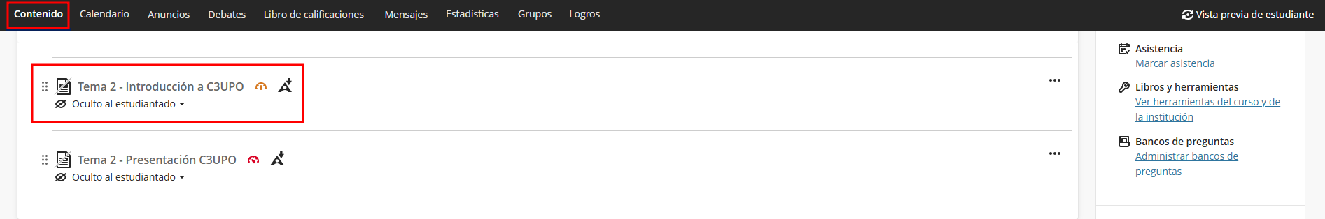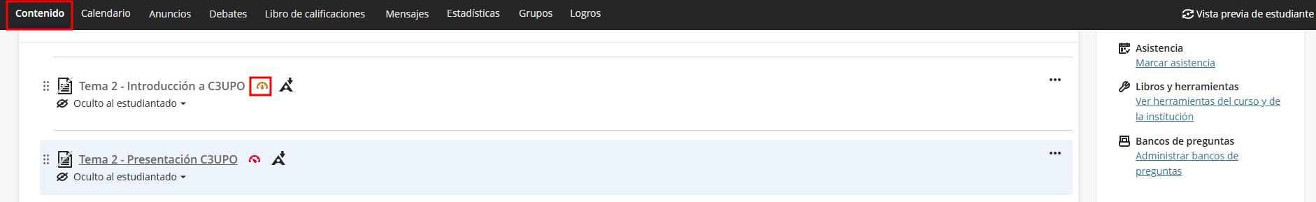 Finalmente podemos ver como el icono a cambia de rojo a verde en la sección de contenidos.