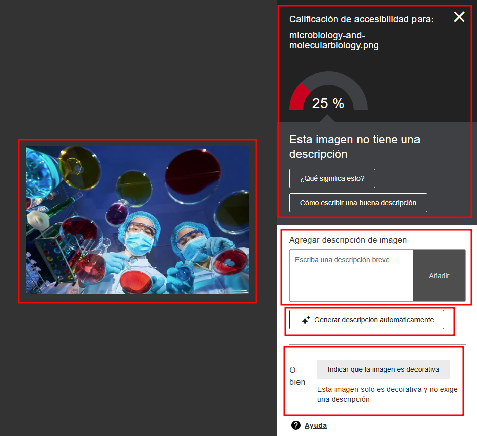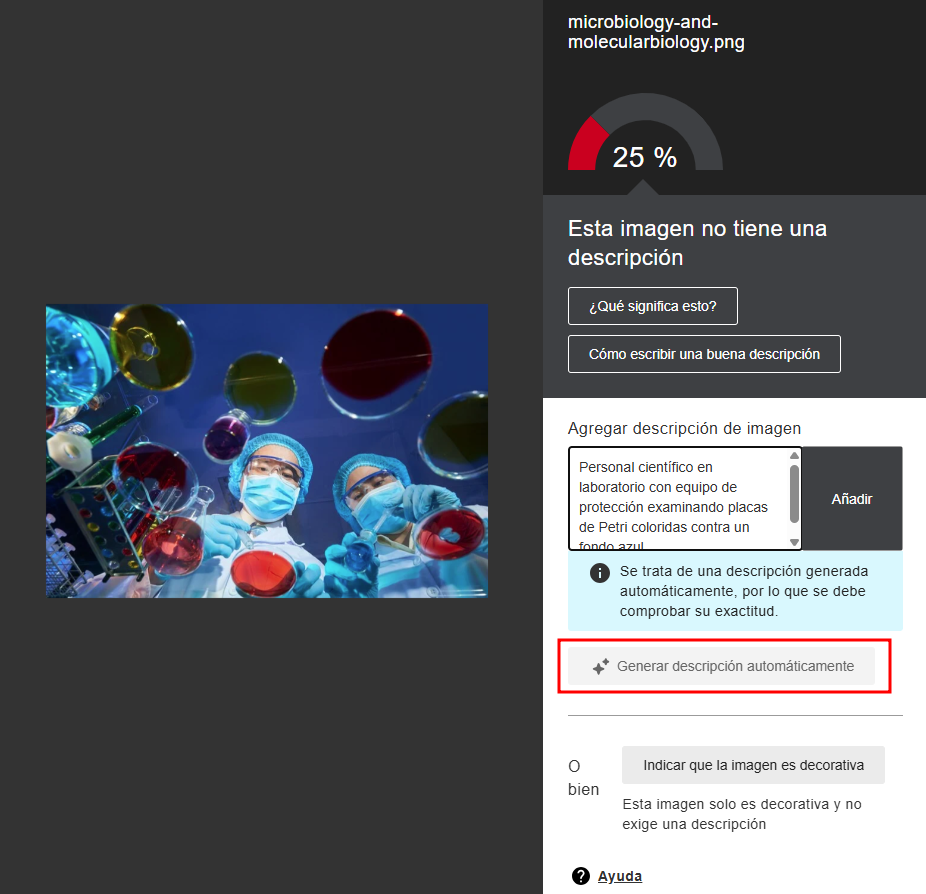 Opción que sugiere un texto alternativo mediante inteligencia artificial. El texto generado puede revisarse o modificarse antes de guardarlo. - Marcar como decorativa