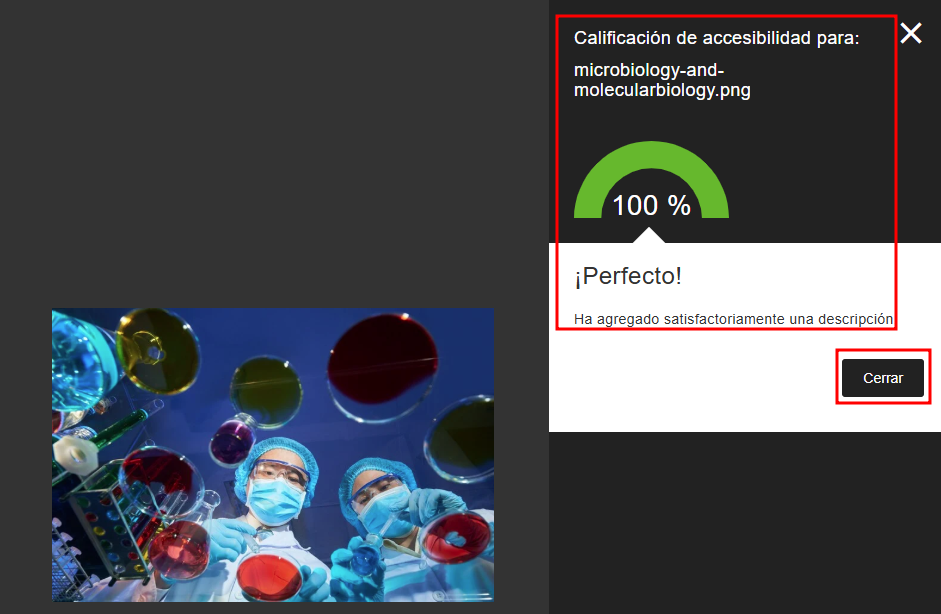 Como vemos genera una descripción muy acertada de la imagen. Aunque siempre debemos revisar el texto generado ya que todo proceso automático puede tener erratas. Al pulsar añadir, Ally vuelve a evaluar la descripción de la imagén y puntua su accesibilidad.