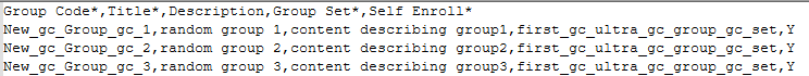 Group Code*,Title*,Description,Group Set*,Self Enroll*