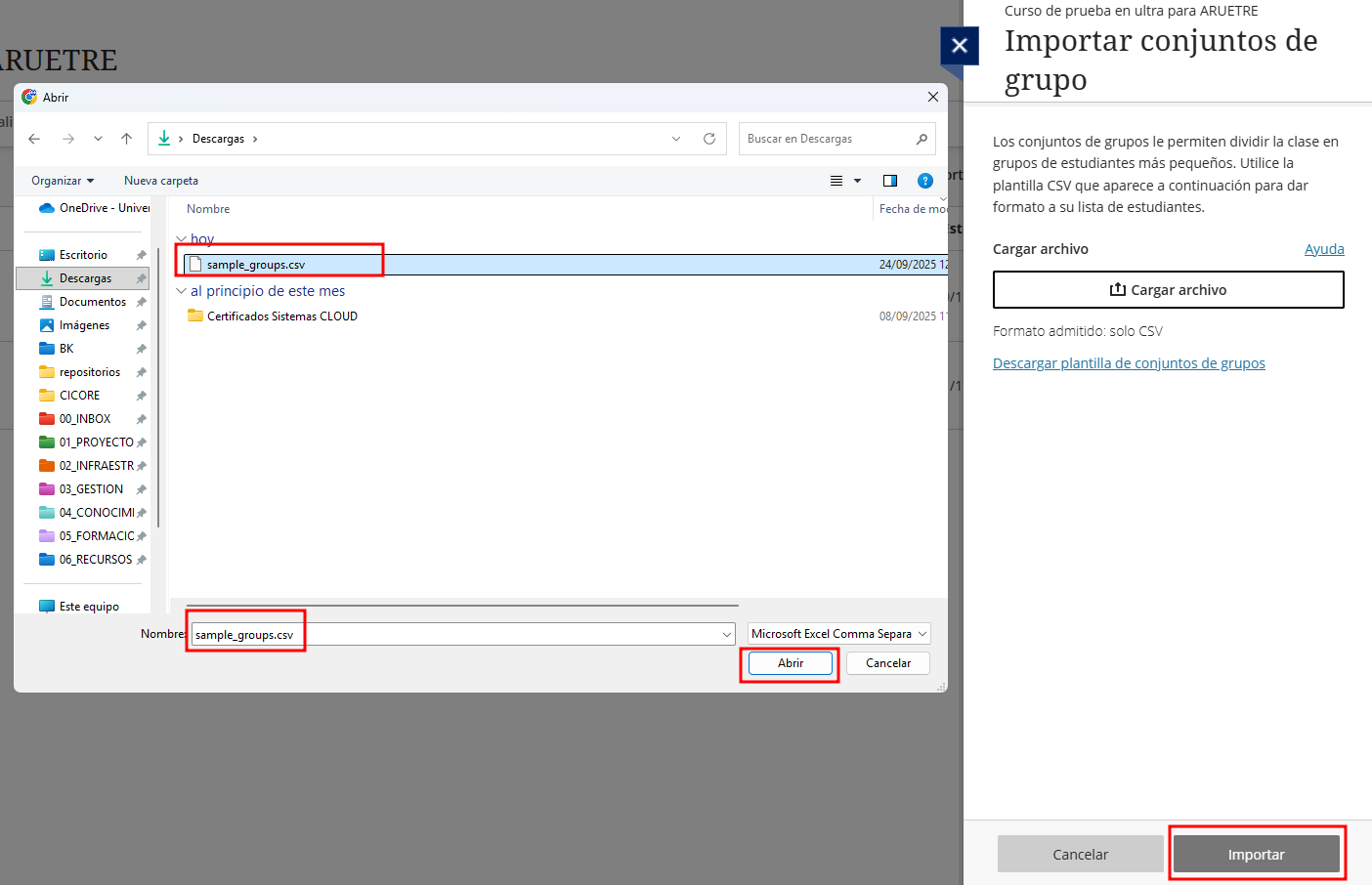 - Importar un conjunto de grupos ya existente, lo que resulta útil cuando se desea reutilizar configuraciones previas o mantener la coherencia entre distintas asignaturas o cursos.
