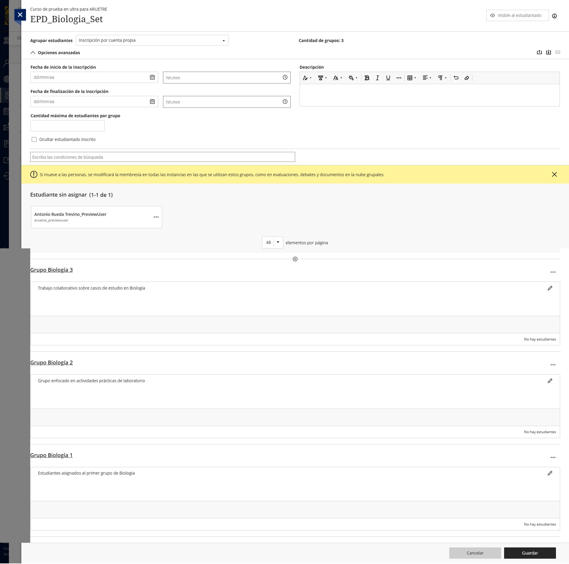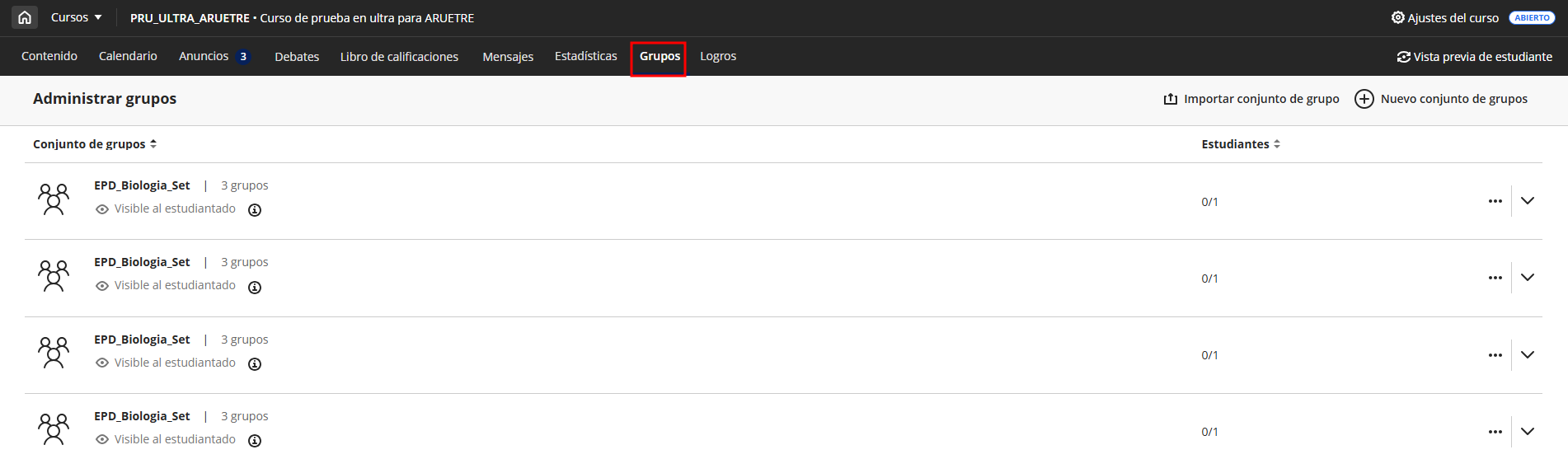 En este ejemplo se muestran tres grupos pertenecientes al mismo conjunto (EPD_Biologia_Set).