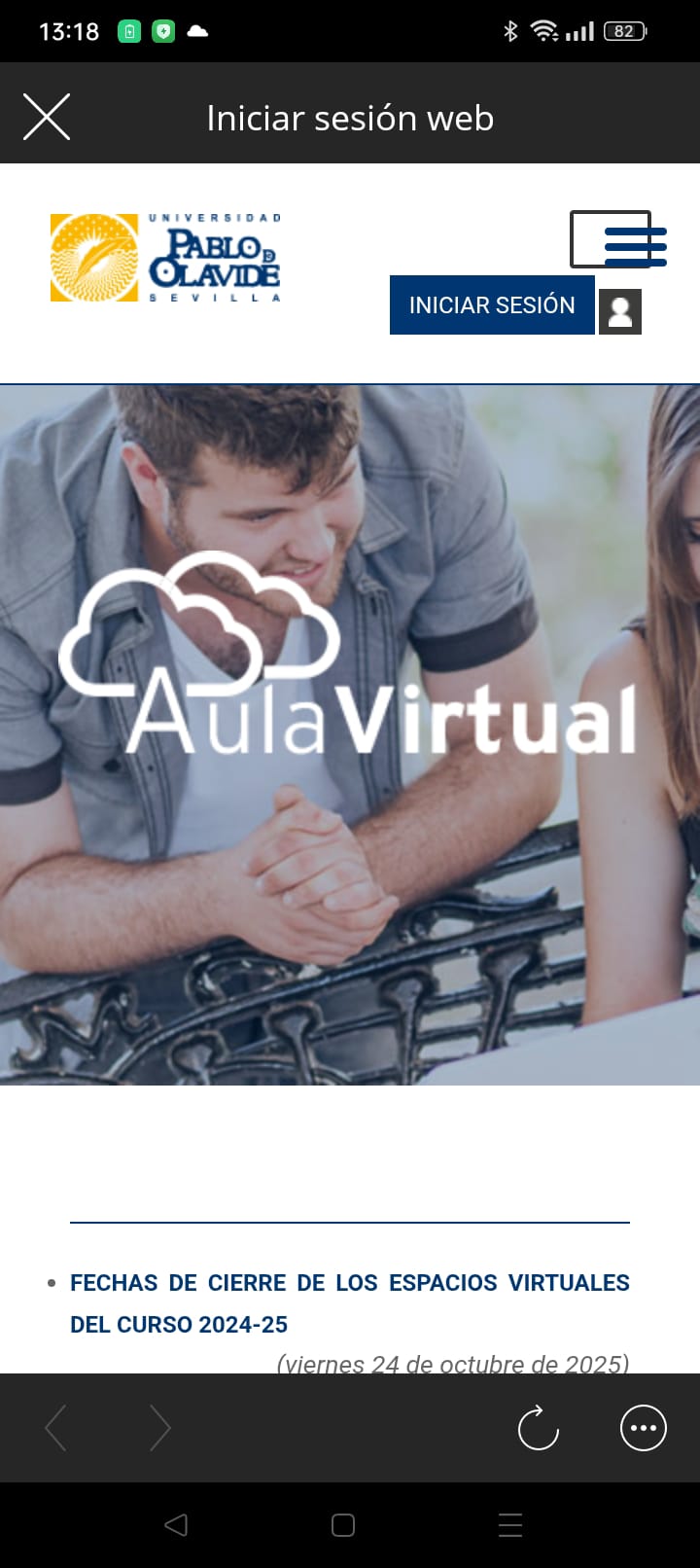 - En la parte inferior hacemos clic en Continuar al inicio de sesión web y nos llevara al portal web de la universidad. Pulsa Iniciar sesión.