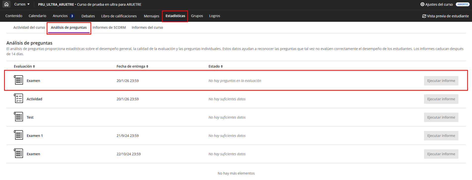 Esta herramienta ofrece estadísticas sobre el desempeño general, la calidad de las preguntas y los patrones de respuesta, lo que ayuda a detectar posibles problemas en la redacción, el nivel de dificultad o la capacidad de discriminación de cada ítem. Los informes generados solo están disponibles durante un periodo limitado, ya que caducan a los 14 días.