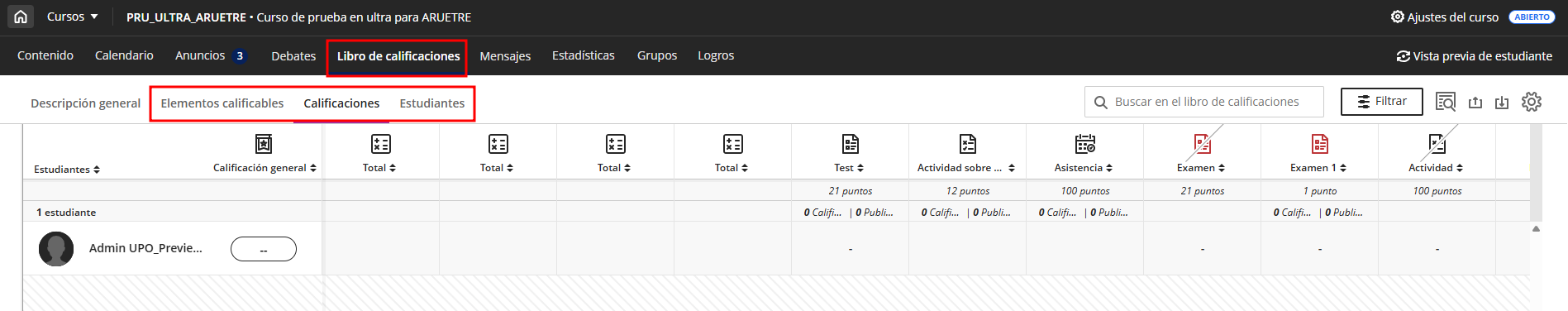 Para acceder, pulsamos en el enlace "Libro de calificaciones" en la barra de navegación superior del curso.