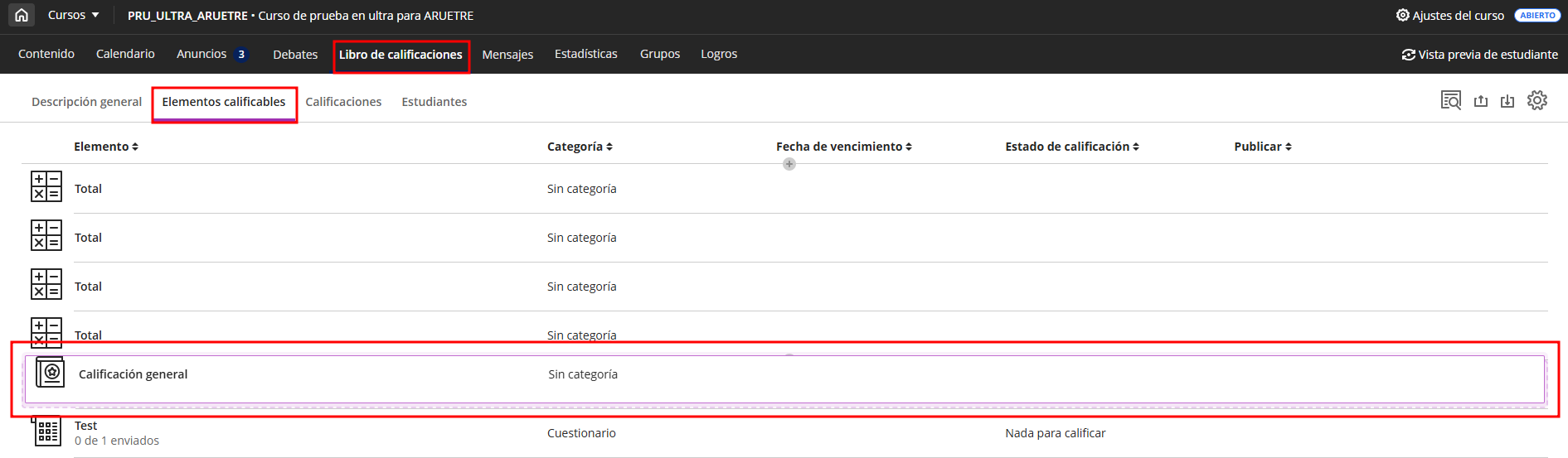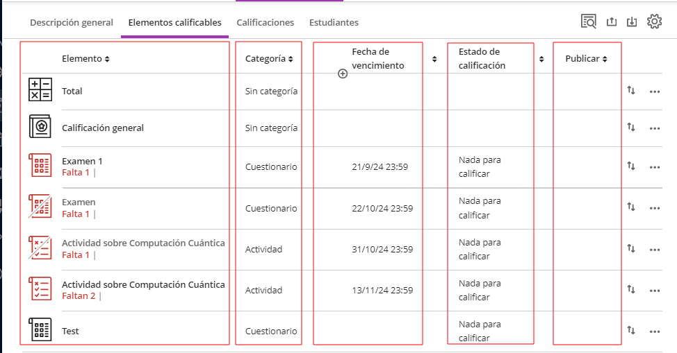 Podemos ver las fechas de vencimiento, el estado de calificación y las categorías de los elementos calificables.