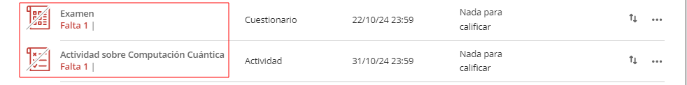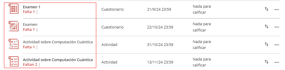 Los elementos a los que les faltan envíos después de la fecha límite se muestran en rojo, de esta forma podemos saber el número de alumnos que no han realizado la entrega.