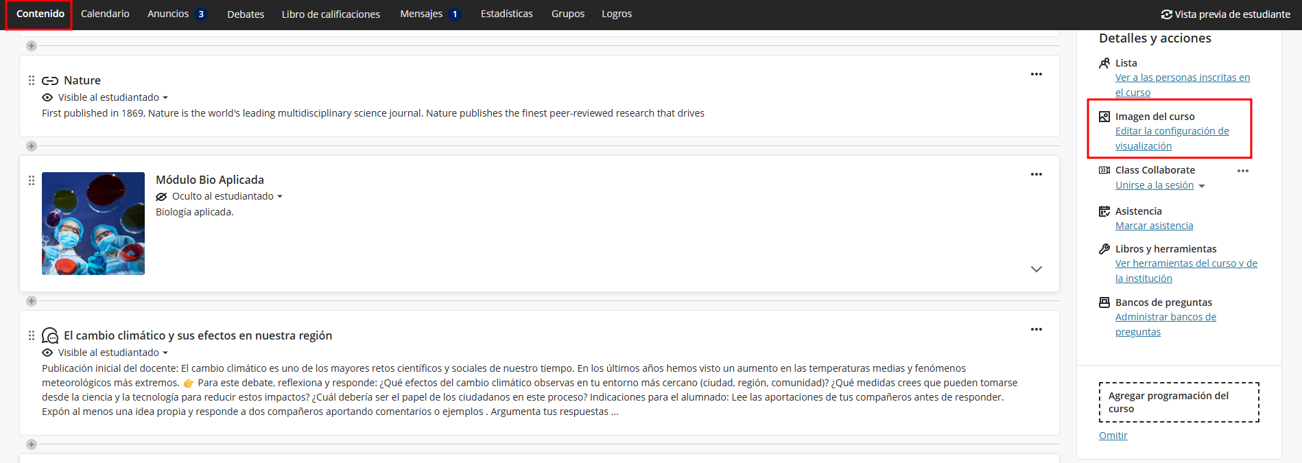 Nos dirigimos a el curso y en la sección Contenido en la parte derecha hacemos clic sobre Imagen del curso