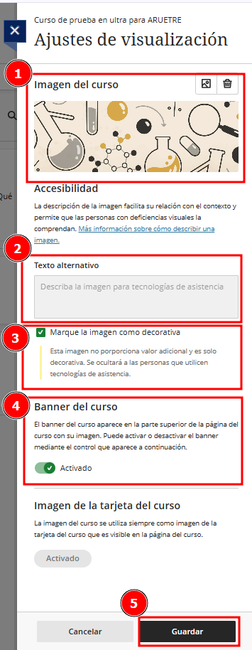 En el menú lateral Ajustes de visualización, podemos modificar la imagen del curso, tanto en su versión banner como su versión tarjeta.