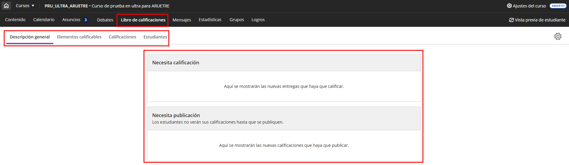 - Ver todas las actividades calificables (tareas, exámenes, debates, cuestionarios, etc.).