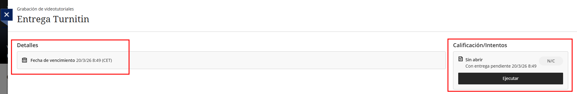 Indica el día y la hora límite para entregar la actividad en Turnitin. Después de este momento, la plataforma puede considerar la entrega fuera de plazo según la configuración de la actividad. -