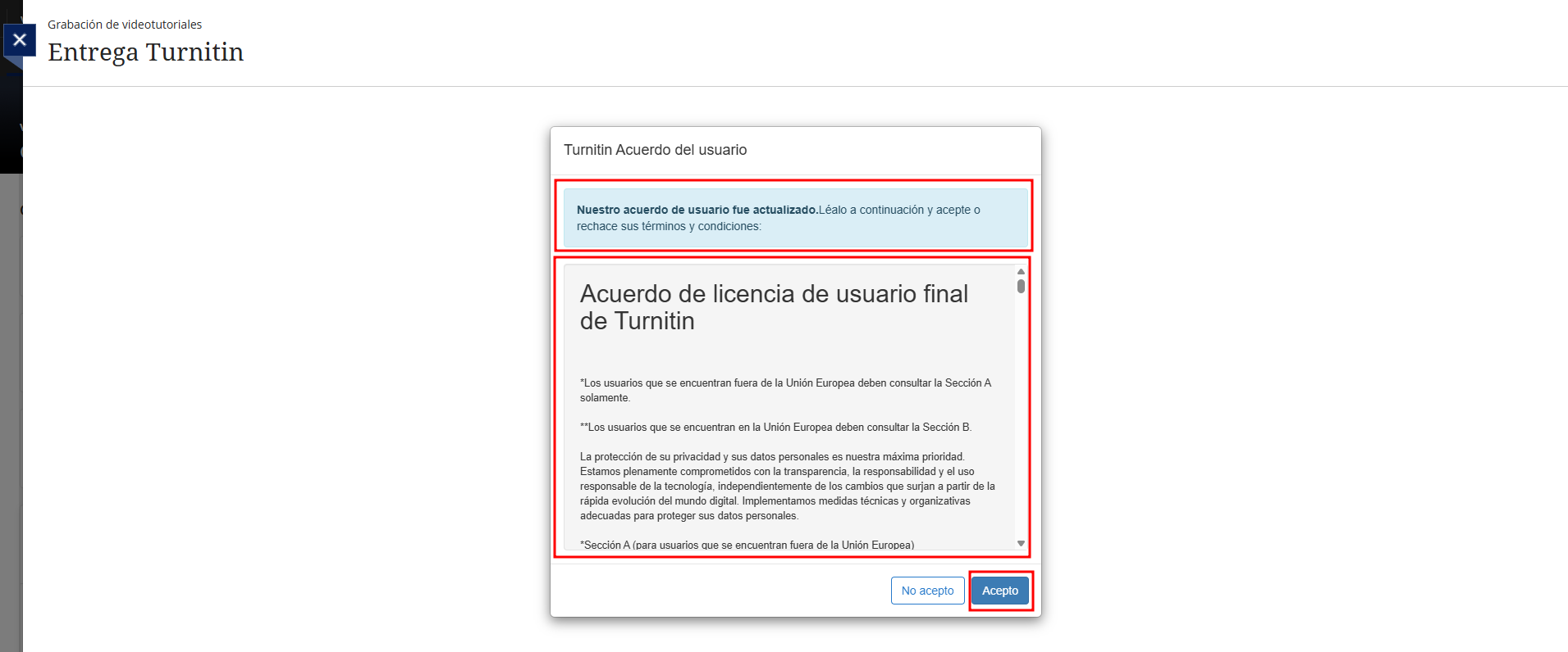 Antes de realizar la entrega del trabajo en Turnitin, el estudiantado debe leer y aceptar el acuerdo de licencia de usuario final de la herramienta. Este acuerdo recoge las condiciones de uso del servicio y la forma en que Turnitin gestiona los documentos y los datos asociados al análisis de similitud.