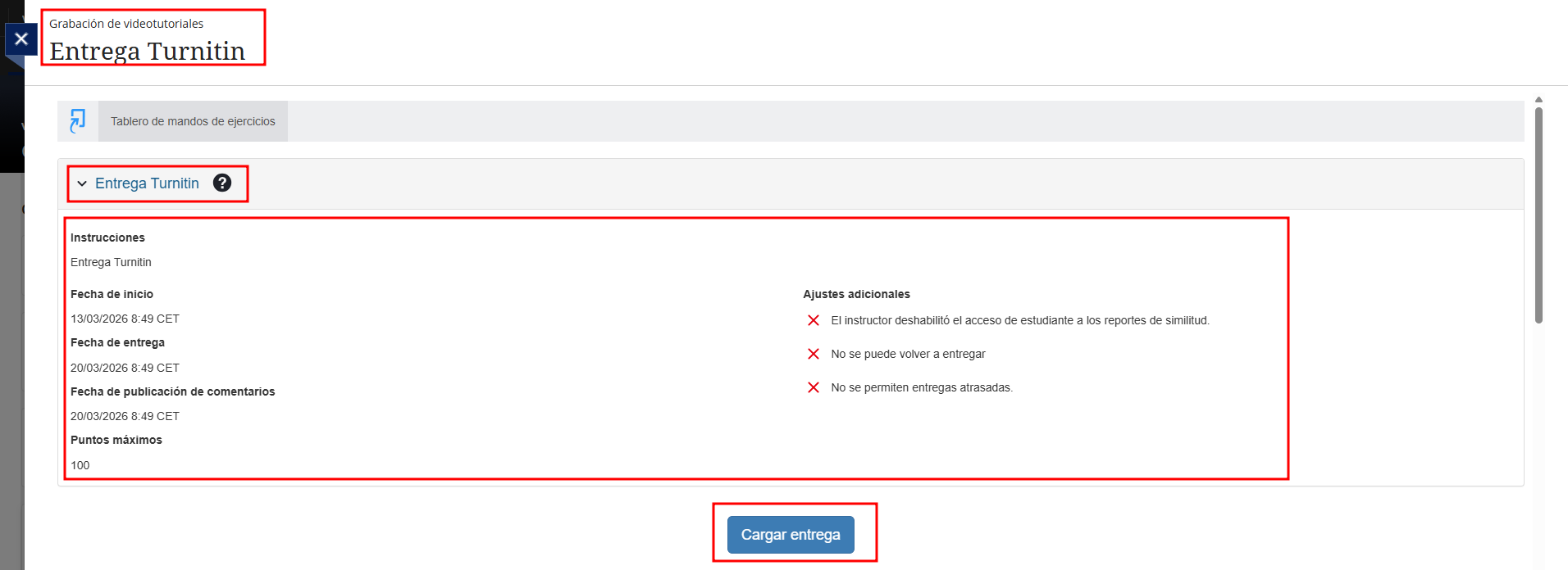 Para realizar la entrega, pulsamos sobre Cargar entrega.