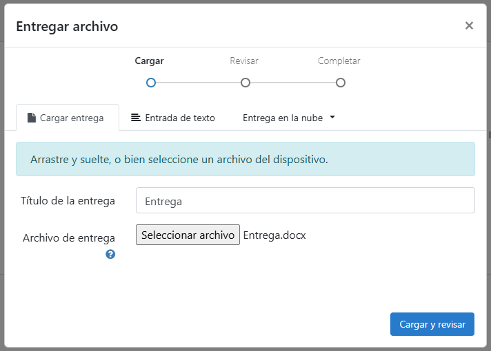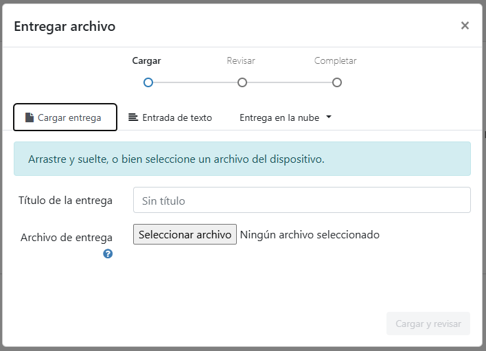 La plataforma ofrece diferentes formas de enviar el trabajo:- Cargar entrega: subir un archivo desde el ordenador o dispositivo.