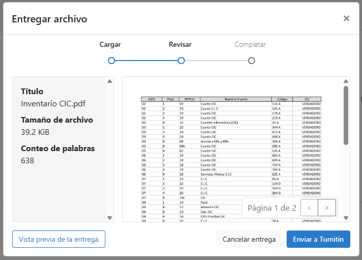 Una vez cargado el archivo, Turnitin muestra una vista de revisión del documento antes de completar el envío. En esta pantalla el estudiantado puede comprobar que el archivo seleccionado es correcto.