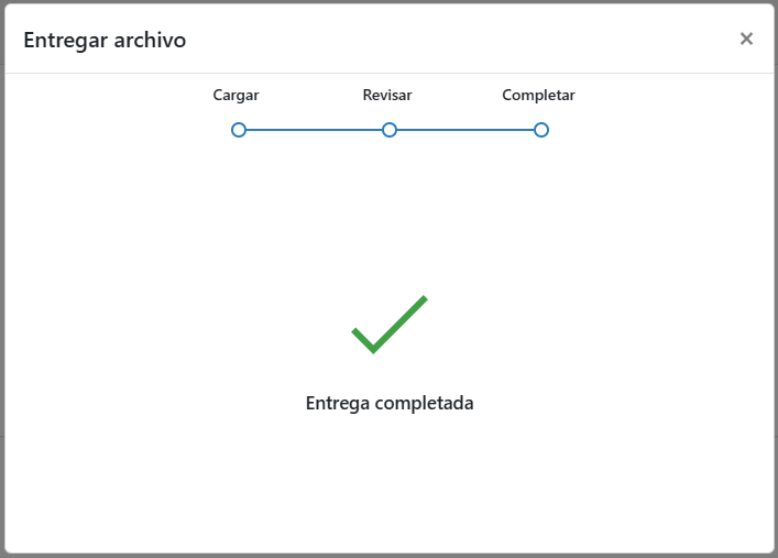 El sistema muestra un mensaje indicando que la entrega se ha cargado correctamente. Desde este aviso también es posible descargar el recibo digital de la entrega, que sirve como comprobante de que el documento ha sido enviado. -
