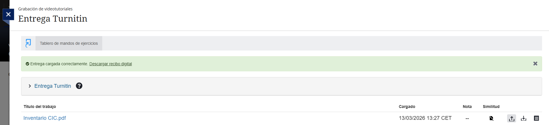 Permite acceder a la actividad de Turnitin para subir el documento que se desea entregar. Al seleccionar esta opción se abrirá el entorno de entrega donde se podrá cargar el archivo correspondiente al trabajo.