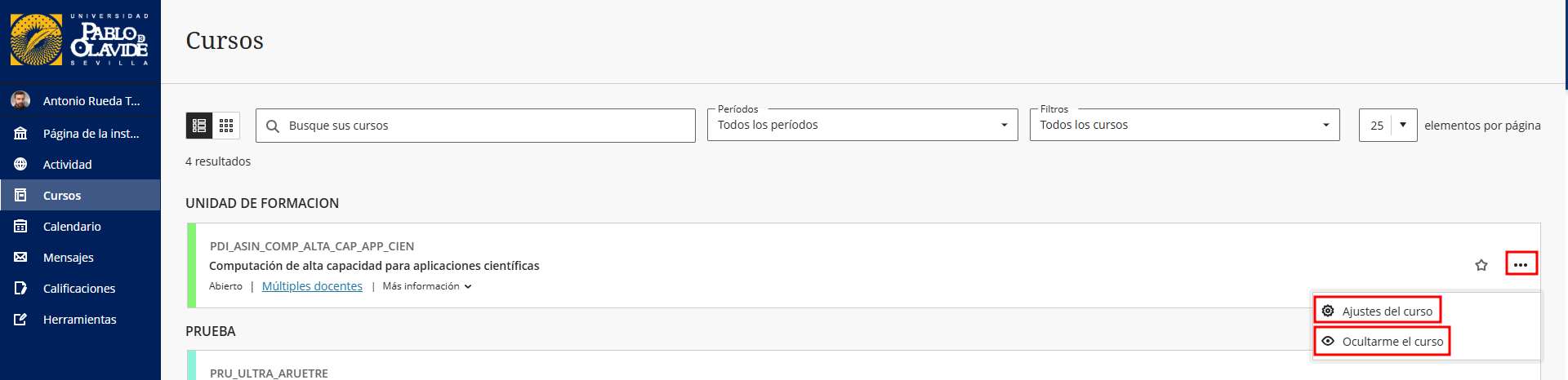 - Periodo: Filtro para mostrar cursos según el periodo académico (actual, anteriores, todos, etc.).