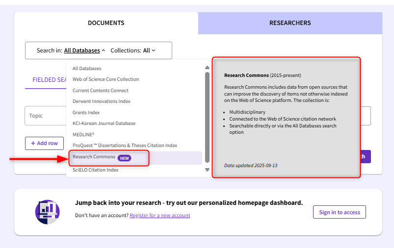 Clarivate ha incorporado recientemente la colección Research Commons a la base de datos Web of Science. Esta nueva colección se basa en datos de Crossref y OpenAlex y amplía la red de citaciones de Web of Science con: