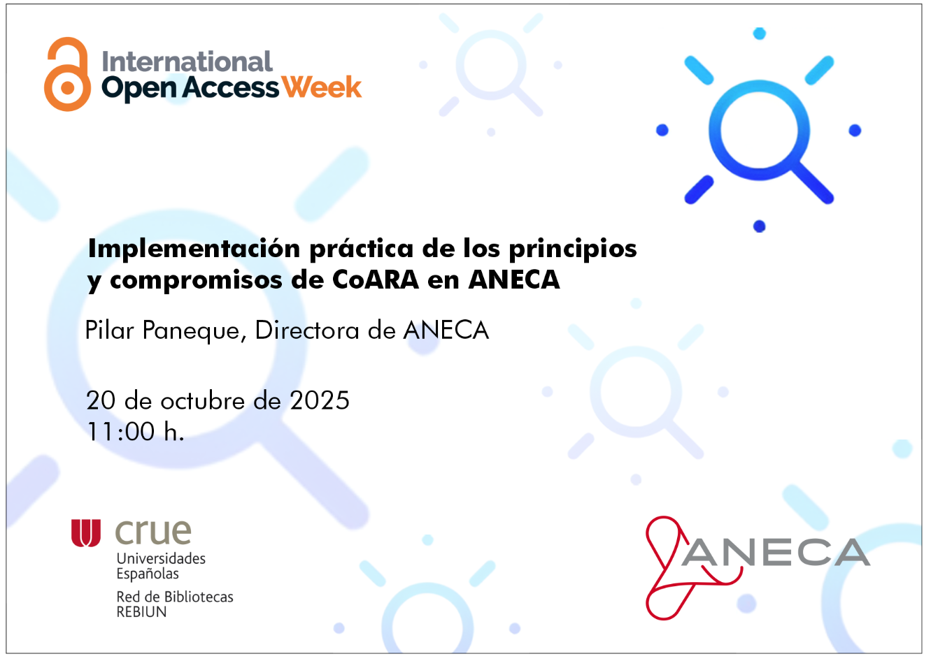 REBIUN ha organizado, dentro del marco de la celebración de la Semana Internacional del Acceso Abierto (del 20 al 26 de octubre) el seminario: Implementación práctica de los principios y compromisos de CoARA en ANECA, a cargo de Pilar Paneque, directora de la Agencia Nacional de Evaluación de la Calidad y Acreditación (ANECA)