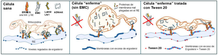 Los experimentos realizados con levaduras deficientes en EMC mostraron que la acumulación de ergosterol endurece las membranas celulares y provoca la retención de proteínas mal plegadas, que terminan desplazándose a las mitocondrias, sobrecargándolas hasta causar su atrofia y pérdida de función respiratoria. Sin embargo, los investigadores descubrieron que estos efectos pueden revertirse mediante dos estrategias: inhibiendo la síntesis de ergosterol con ketoconazol o tratando las células con el emulsionante tween20 (E432), que restaura la fluidez de las membranas.