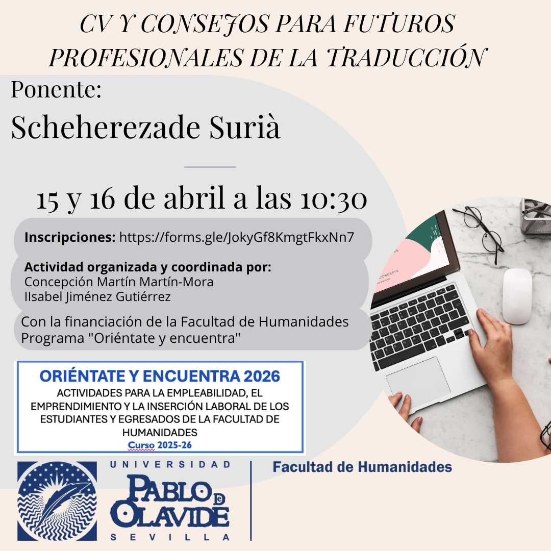 Los próximos 15 y 16 de abril, a las 10:30, tendrá lugar el seminario «CV y consejos prácticos para futuros profesionales de la traducción», organizado por Concepción Martín e Isabel Jiménez, profesoras del Área de Filología Francesa. La actividad se realizará online, a través de Blackboard Collaborate, previa inscripción en el siguiente enlace: