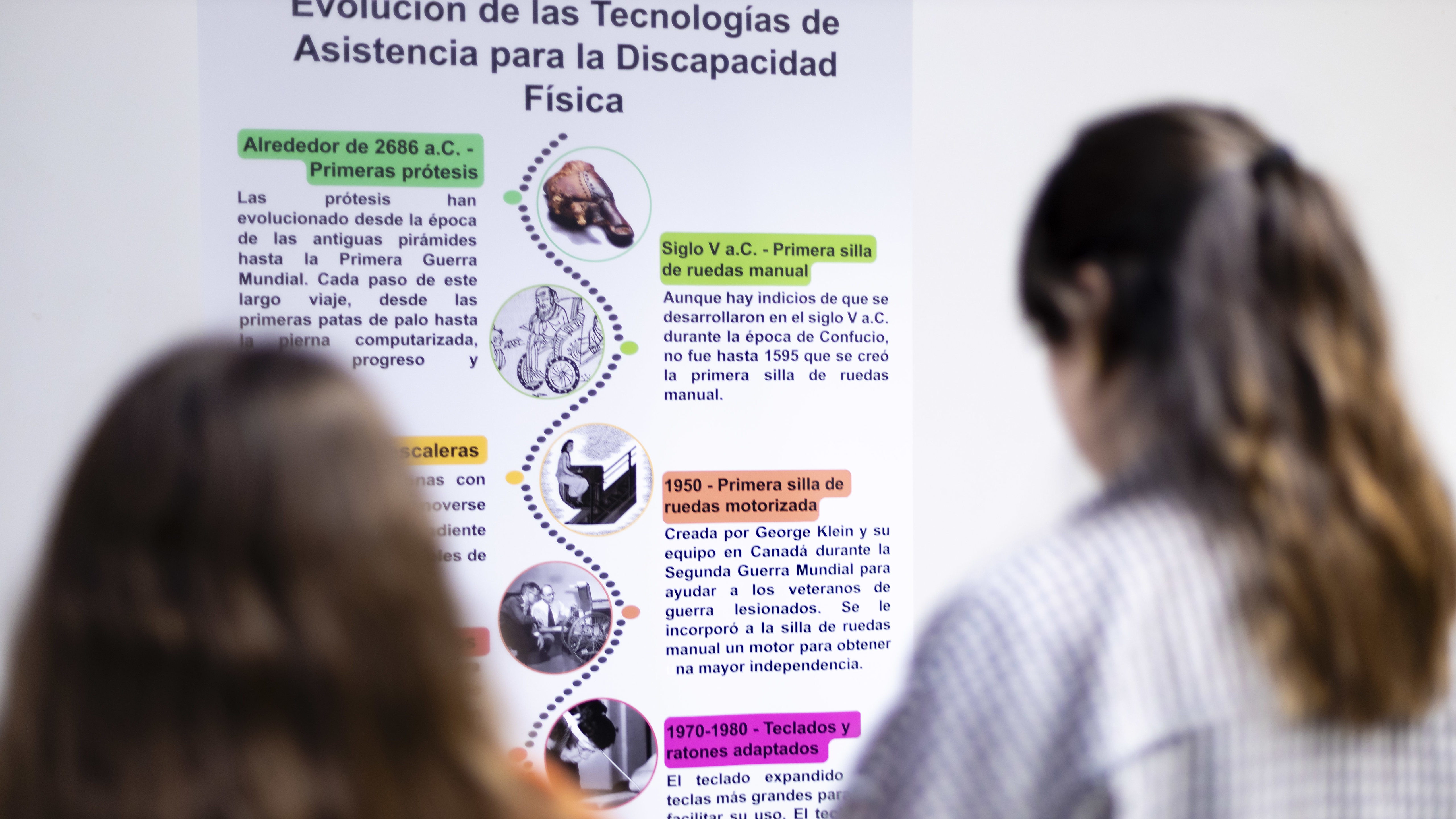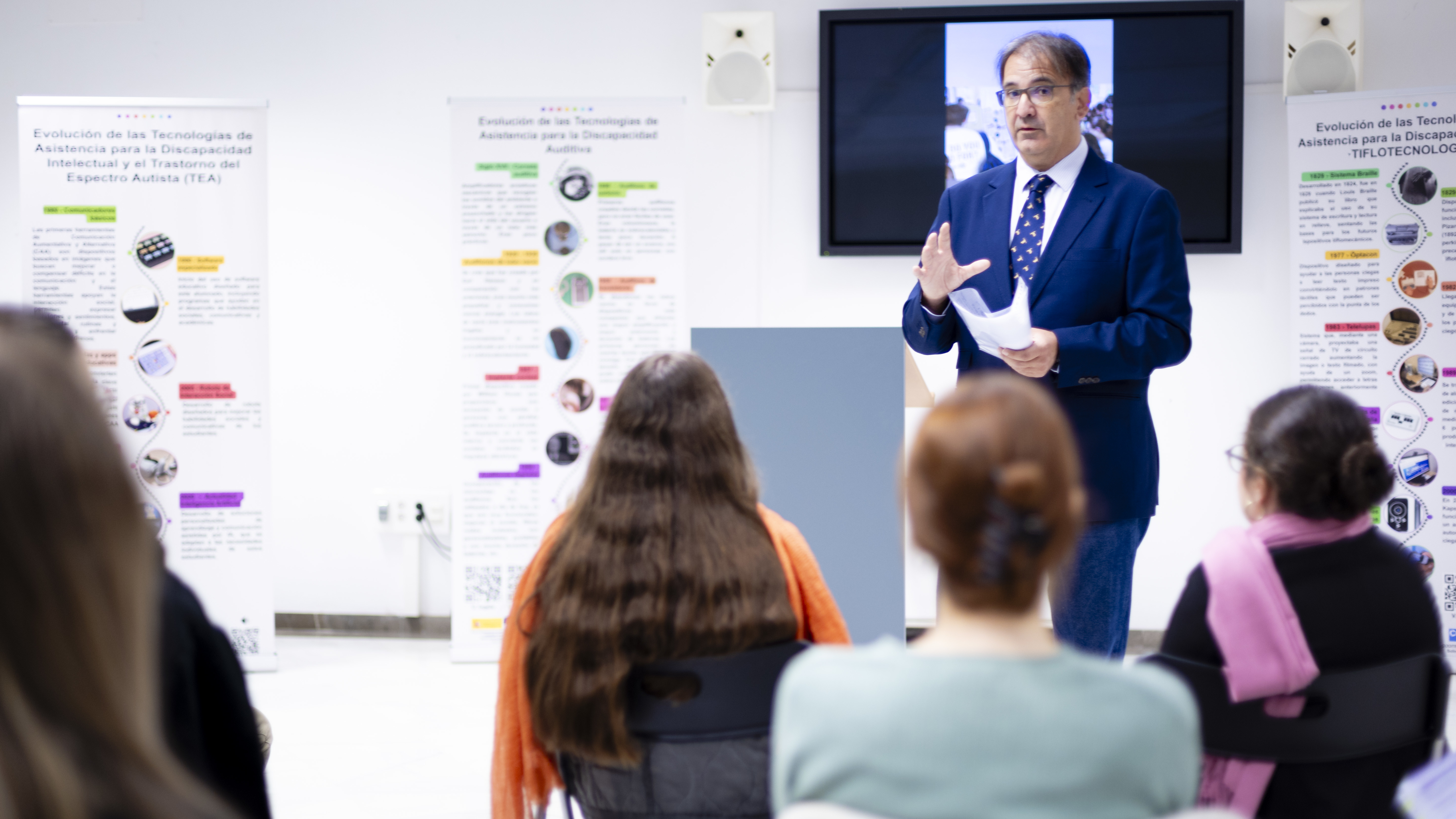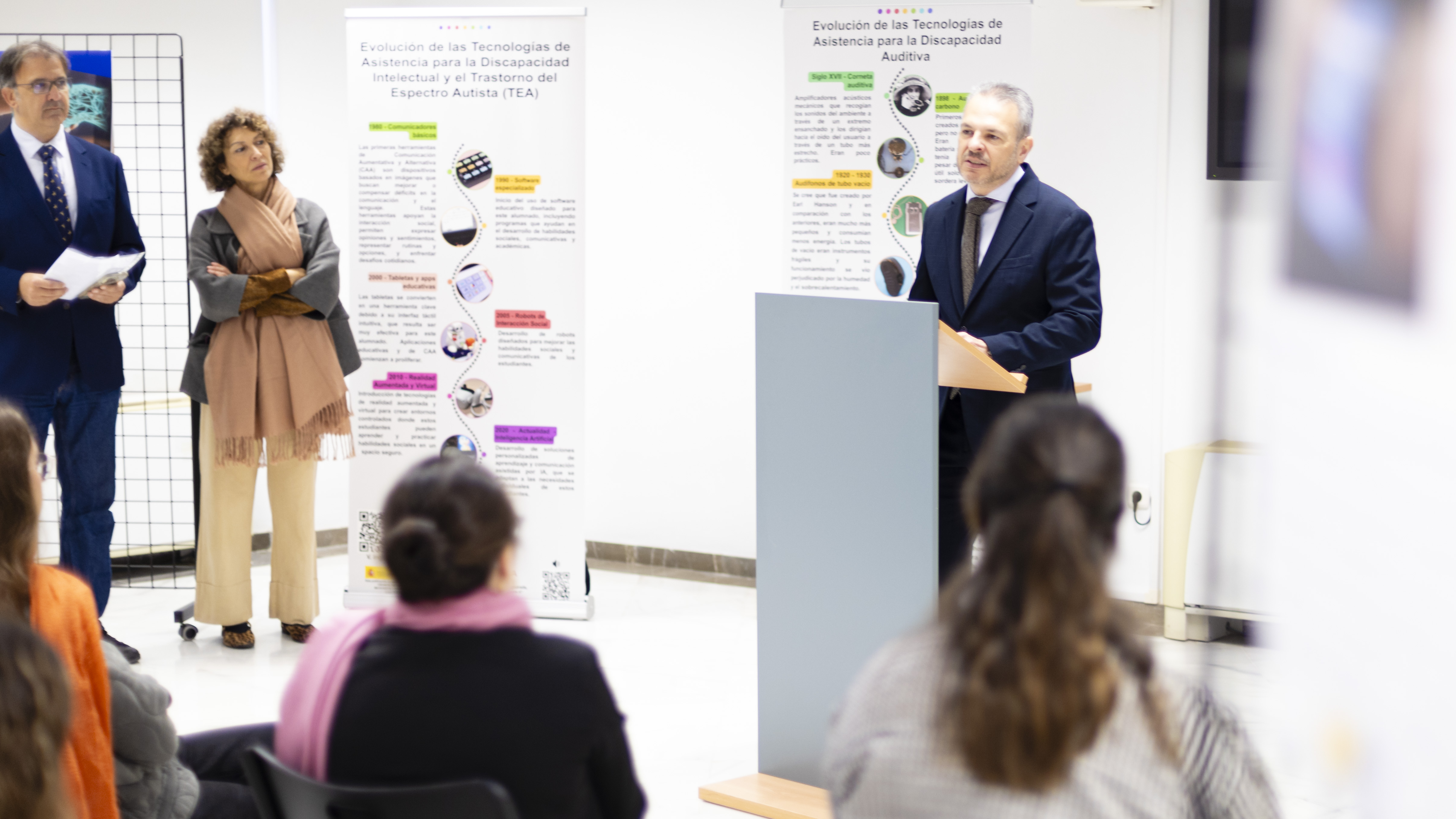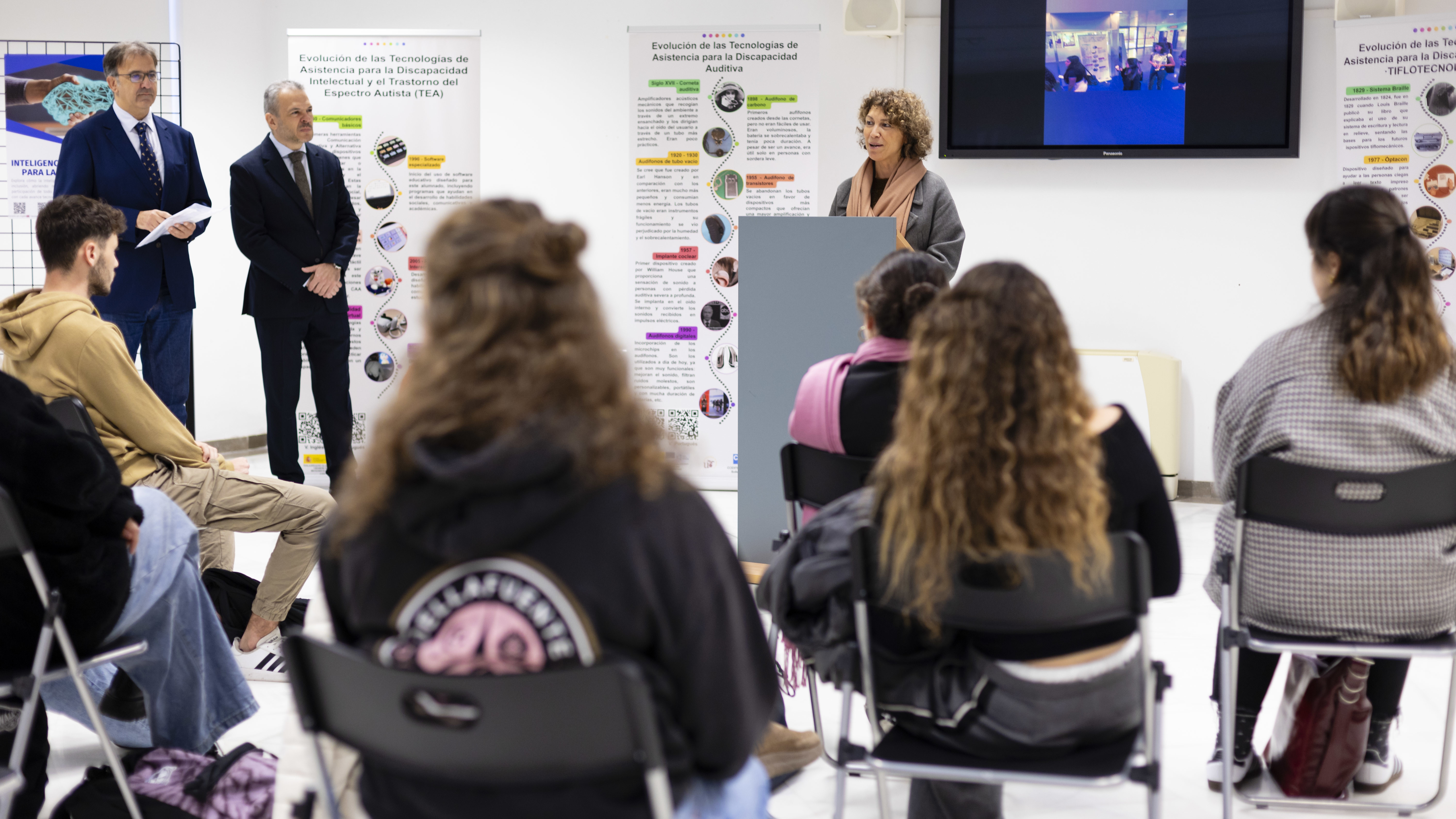 28/11/2024. Laura Gómez, vicerrectora de Cultura y Políticas Sociales de la Universidad Pablo de Olavide, junto a los profesores David Cobos (UPO) y Pedro Román (US), ha presentado en la Biblioteca/CRAI la exposición 'Recursos Tecnológicos: Tecnologías de Asistencia. Pasado Presente y futuro en las diferentes discapacidades', fruto del proyecto de investigación 'Capacitación docente en competencias digitales inclusivas como apoyo al alumnado con Trastornos del Espectro Autista' (CODITEA).