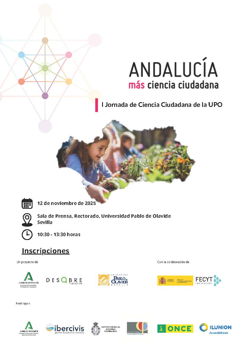 La Universidad Pablo de Olavide, de Sevilla, ha organizado la 'I Jornada de Ciencia Ciudadana de la UPO' que se celebrará el miércoles 12 noviembre, de 10:30 a 13:30 horas, en la Sala de Prensa del Rectorado de dicha universidad.