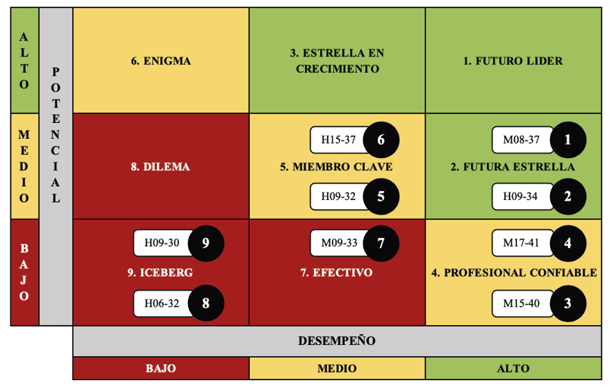 Se observa que hay cuatro cajas que no tienen empleados asignados: 1 (futuro líder), 2 (estrella en crecimiento), 6 (enigma) y 8 (dilema). El 33 % de los colaboradores se encuentra mapeado en el grupo de talento reducido, el 44 % en el grupo de futuras promesas y solo el 22 % en el grupo elite.