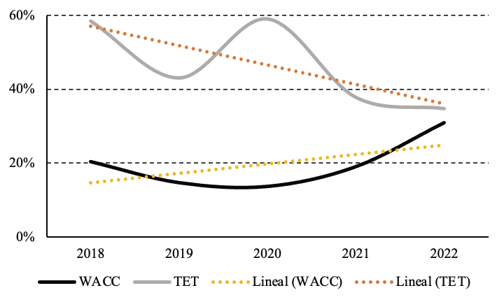 El análisis revela una correlación débil pero negativa entre la TET y el WACC en la mayoría de los años analizados. Este hallazgo indica que, contrariamente a lo esperado, una mayor carga tributaria no necesariamente incrementa el costo de capital. Los hallazgos ponen en evidencia que la ambigüedad regulatoria, más que la tasa nominal del impuesto de renta es el principal determinante del costo de capital. Esta conclusión se alinea con Duque & Báez (2012), quienes demostraron que la carga fiscal no necesariamente se traduce en un menor costo del capital, dado que el riesgo percibido puede anular los beneficios del escudo fiscal.