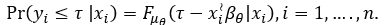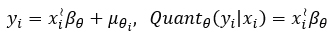 Donde Quantθ (yi│xi ) es el cuantil condicional de yi , condicionado al vector de regresores xi. Si Fμθ (∙) sería conocida, se podría utilizar varias técnicas para estimar βθ ; sin embargo, la distribución del término de error μθi no está especificada. Únicamente se asume en (1), que μθi cumple la restricción cuantílica de Quantθ (μθi│xi )=0.