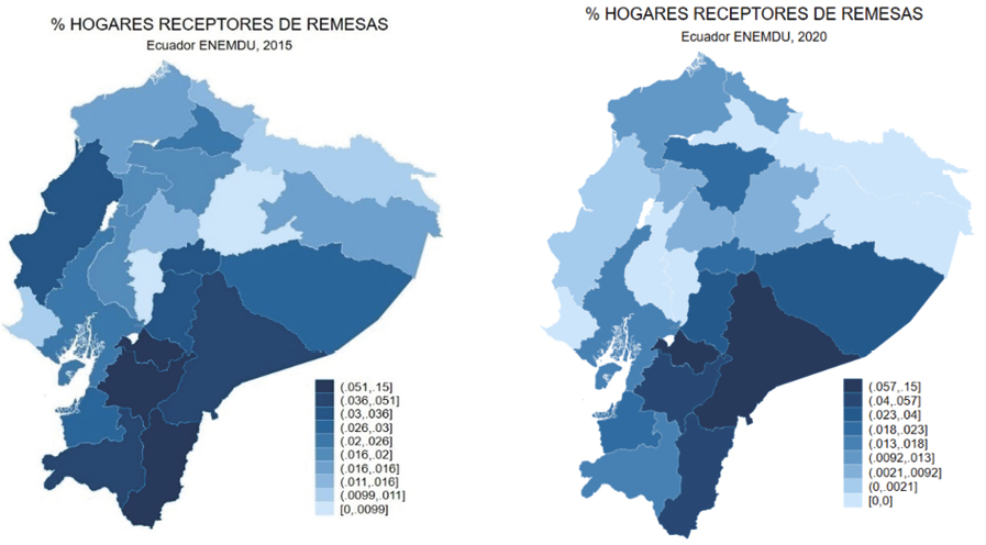 * Nota: Las ilustraciones corresponden a la proporción de hogares que reciben remesas sobre el total de hogares por provincia para los años 2015 y 2020.