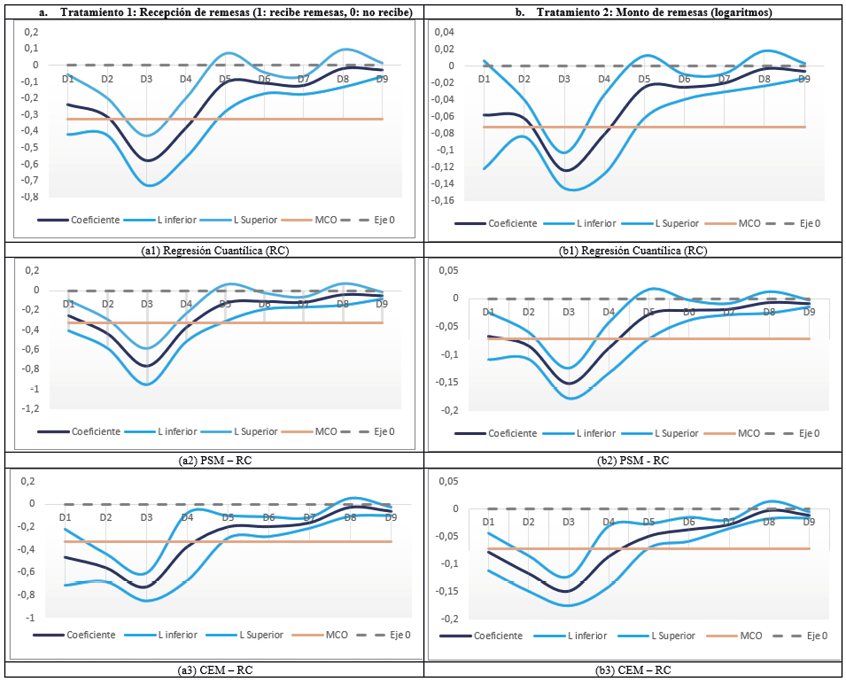 Los estadísticos descriptivos para el año 2015 (ver tabla 4 del anexo 3), muestran que el 2,9 % de los hogares recibe remesas, con un patrón marcadamente regresivo; 4,9 % en el quintil 1 y un 1,7 % en quintil 5. Este patrón anticipa un impacto distribucional diferenciado, más intenso en la cola inferior de la distribución salarial. Por otra parte, a medida que el ingreso aumenta, crece la proporción de hombres en la muestra (de 44,4 % a 83,4 %), es decir en los quintiles de mayores ingresos es más difícil encontrar mujeres. Igualmente, a medida que el ingreso aumenta, crece la proporción de personas que residen en zonas urbanas (de 50,5 % a 78,5 %), al igual que la cobertura de Seguro Social (de 28,6 % a 68,2 %), mientras que disminuye la presencia rural e indígena, lo que sugiere mayor formalidad y capital humano más altos en los quintiles de mayores ingresos. En la actividad productiva, la participación del sector servicios sube de 15,4 % a 54,5 % y la del primario cae de 61,1 % a 14,0 %; el trabajo por cuenta propia sigue siendo elevado (≈44-56 %), pero desciende levemente en los quintiles superiores, reflejando cierta transición hacia empleos asalariados formales. Patrones similares se observan para el año 2020 entre los estratos de ingresos (datos disponibles a solicitud a los autores). Estos patrones indican que las remesas podrían elevar el salario de reserva y reducir la aceptación de empleos precarizados en los grupos de menor ingreso, lo que respalda la estrategia empírica del estudio basada en regresiones cuantílicas para captar efectos heterogéneos.