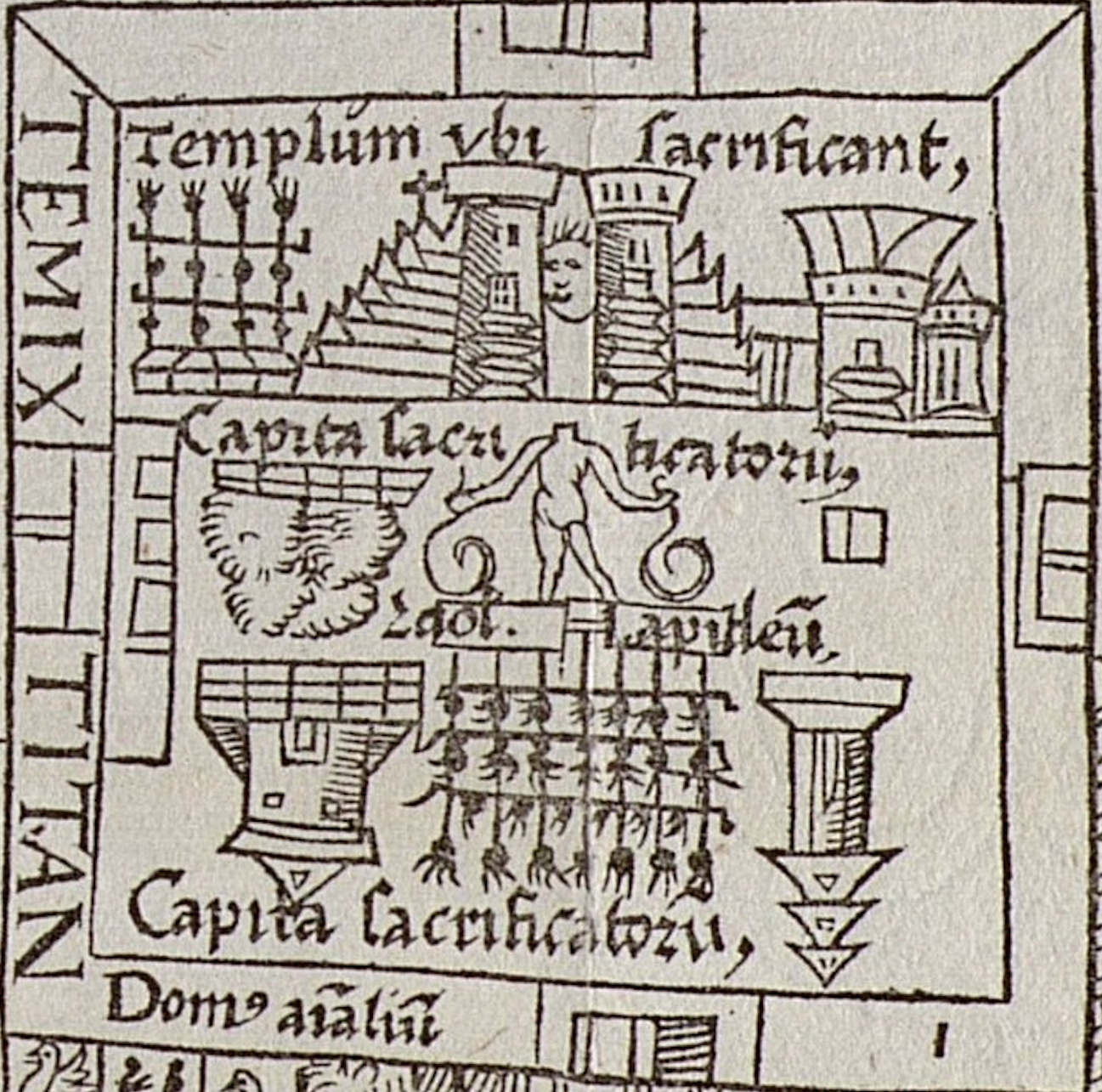 [1] El documento cartográfico conocido como “Plano de Tenochtitlan y Mapa del Golfo de México” se encuentra en una xilografía en papel con una dimensión de 34x48 cms. A la derecha de la xilografía encontramos el Plano de Tenochtitlan. El Plano puede dividirse en dos segmentos. El primero es el centro ceremonial en el cual aparecen las torres dedicadas a Huitzilopochtli y Tlaloc, las cuales eran parte del Templo Mayor; dos tzompantli (hilera de cráneos) hacia la derecha del Templo y frente a este; y una estatua decapitada junto con la inscripción “ idol lapideum ” (‘ídolo de piedra’). A la derecha del Templo aparece otra construcción, probablemente el templo dedicado a Tezcatlipoca. A la izquierda del tzompantli más grande hay un edificio que pareciera ser el Calmecac, colegio donde estudiaban los hijos de los nobles mexicas. A la derecha de aquel tzompantli aparece otro edificio que podría identificarse como el Templo del Sol. Si invertimos la orientación, fuera del sitio ceremonial aparece el lago Texcoco el cual contiene la “casa del placer” y los jardines de Moctezuma en el cuadrante superior izquierdo; en tanto, la ciudad de Tlateloco identificada con la inscripción “ forum ” está en el cuadrante superior derecho. El Plano también presenta el dique de Nezahualcoyotl en la parte inferior del Lago, y en sus riberas se observan diversas ciudades. En el Oeste, tenemos el Bosque de Chapultepec e, inmediatamente a la izquierda, se divisa la bandera de los Habsburgo, la cual presenta el águila bicéfala del Sacro Imperio Romano con el escudo del reino de Austria y el de Castilla. Uno de los puntos destacados del Plano es la inclusión del sistema de acueducto que va desde la fuente de agua cerca del Bosque de Chapultepec hacia la ciudad. Solo tres ciudades son mencionadas además de Tenochtitlan. Dos de ellas pertenecen a la Triple Alianza: “Tesqua” (Texcoco) y “Atacuba” (Tlacopan), además de “Iztapalapa” (Ixtapalapa).