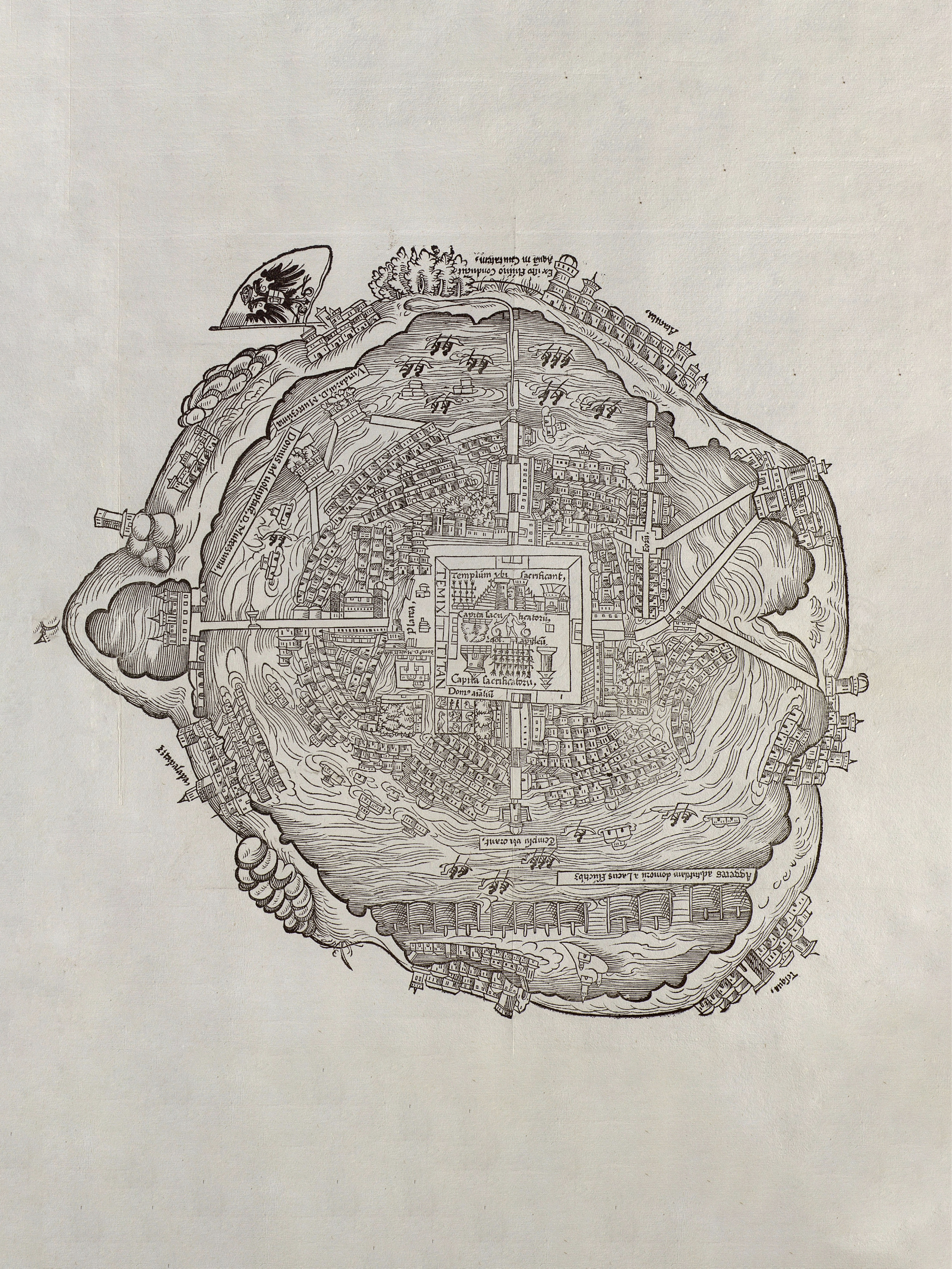 Ya en Nuremberg, Johannes von Revellis, de la corte de Fernando, tuvo acceso a parte de los documentos y tesoros de Tenochtitlan enviados por Carlos V a su hermano, lo que posibilitó que impulsara la publicación de las Relaciones de Cortés y del Plano de Tenochtitlan. Esta serie de eventos explica por qué aparece una edición de las cartas del conquistador junto con una imagen de Tenochtitlan en Nuremberg en 1524. Esta afirmación, si bien define algunas de las cuestiones relativas a la publicación de esta imagen en Europa, también abre una serie de incógnitas sobre la imagen y las motivaciones de la publicación. Por un lado, la aparición de elementos indígenas en la impresión nos invita a pensar la imagen no solo desde una perspectiva europea de organización del espacio sino también desde un punto de vista indígena. De hecho, el estudio de la organización del espacio en los códices mexicanos y en la cartografía novohispana mestiza puede otorgar nuevas herramientas para analizar el plano publicado en Nuremberg.