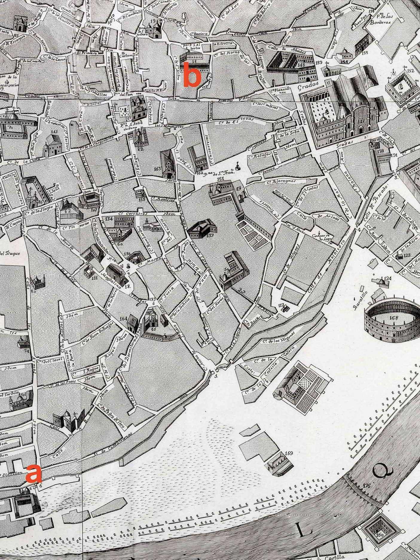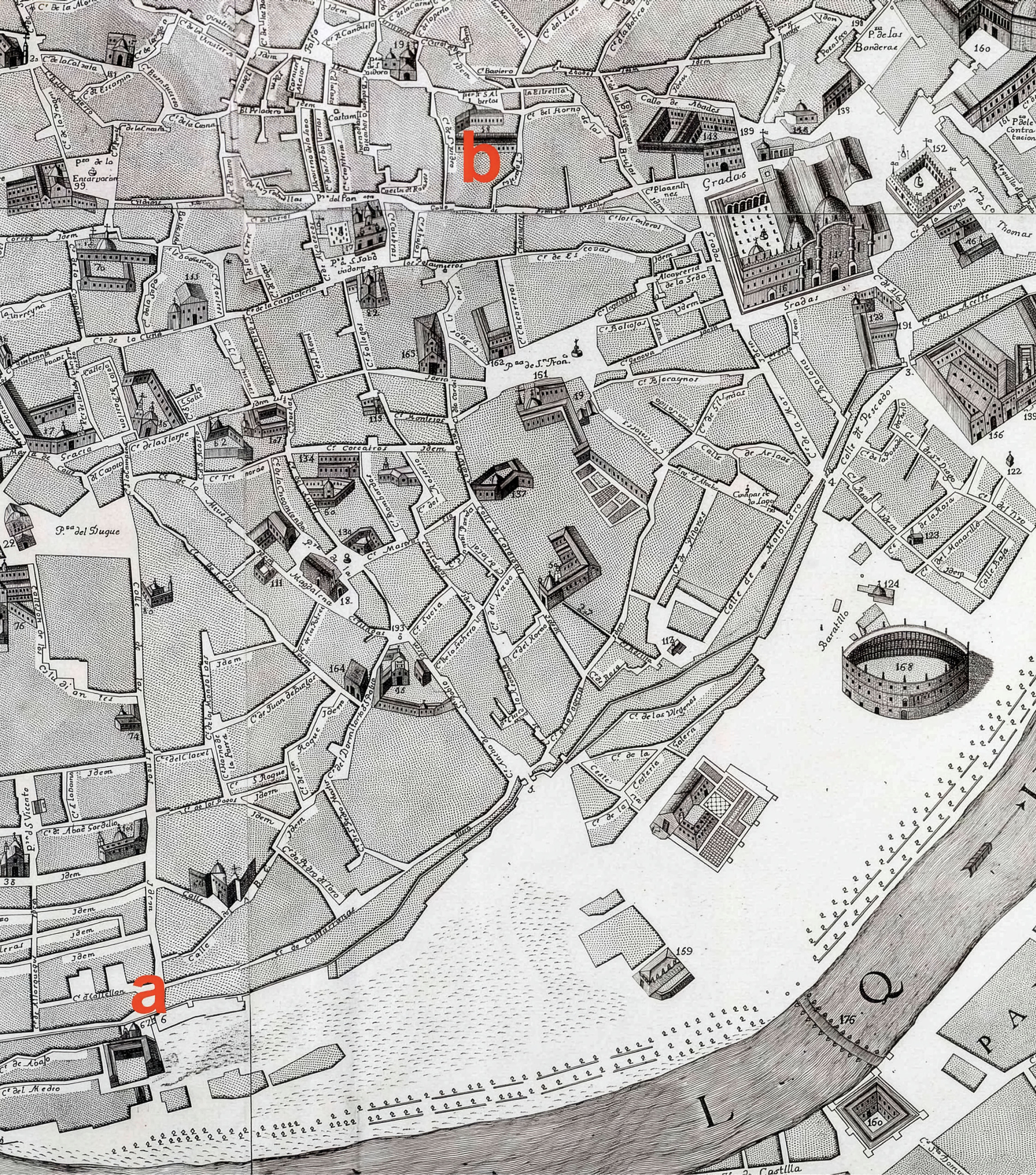 Fig. 1. Francisco Manuel Coelho, Plano topográphico de la M. N. Y M. L. ciudad de Sevilla (detalle), 1771. Biblioteca Virtual de Patrimonio Bibliográfico. El número 6 del plano, indicado aquí con la letra a, se corresponde con la Puerta Real. El número 58 (b) indica el Colegio de San Alberto, destino final de la pintura.